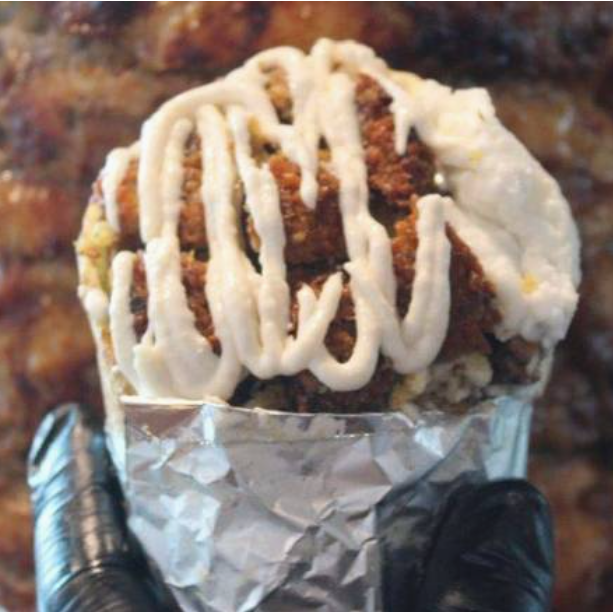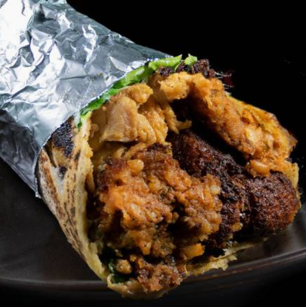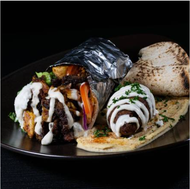 Shawarma relleno con 2 croquetas de falafel, carne mixta (pollo y res) lechuga, tomate, cebolla, salsa de ajo y salsa tahini.