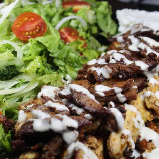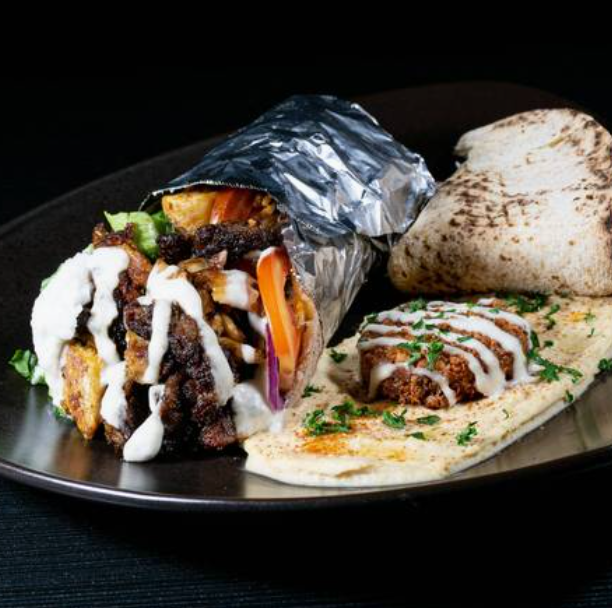 Shawarma de res con pollo, lechuga, tomate, cebolla, salsa de ajo y salsa tahini.
