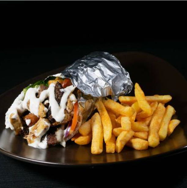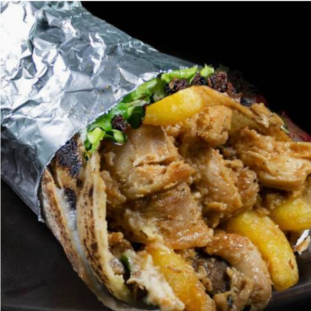 Shawarma relleno de papas fritas, lechuga, tomate, cebolla, salsa de ajo y salsa tahini.