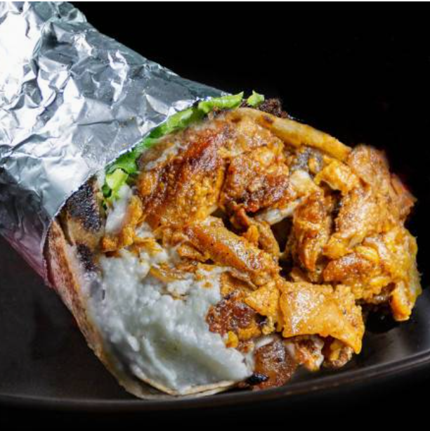 Shawarma de pollo, lechuga, tomate, cebolla, salsa de ajo y salsa tahini.