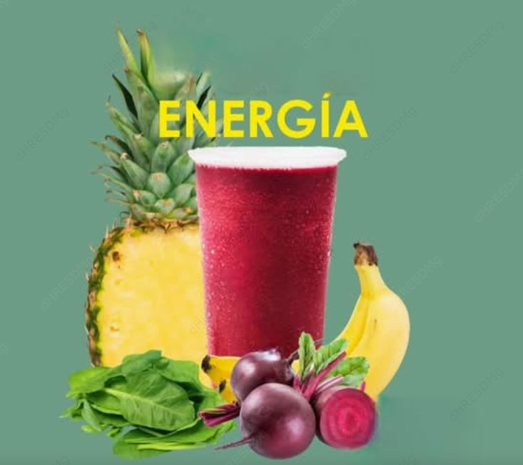 Espinaca, piña, remolacha y banano, base líquida de agua o naranja.