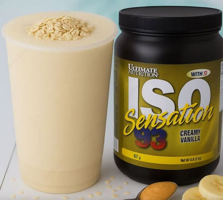 Mantequilla de maní, avena, banano y proteína Iso.