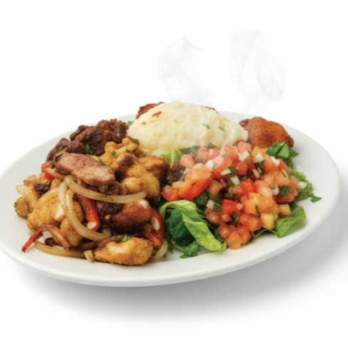 Pollo frito (1/4 muslo), fajitas, lomo o pollo, chuleta o bistec.