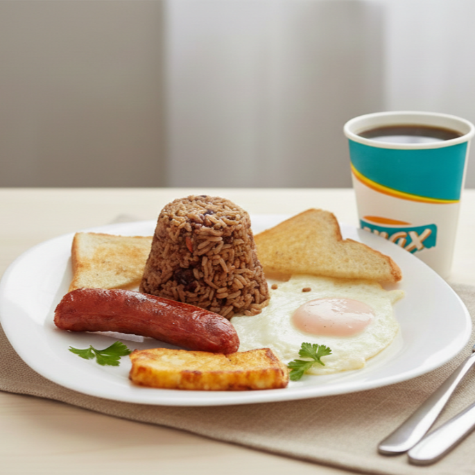 Delicioso pinto con salchichón, salchicha, queso, huevo acompañado de una bebida caliente.