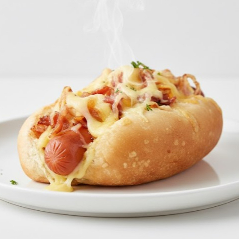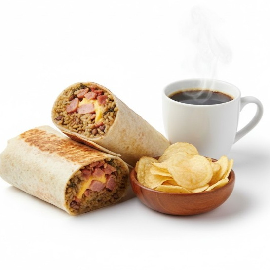 Con tocino y queso, papas tostadas y café.