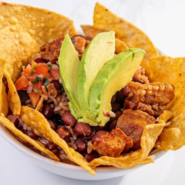 Chicharrón, frijoles, arroz, pico de gallo y chips.