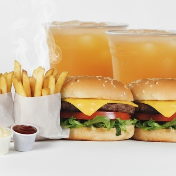 Dos hamburguesas con queso, papas pequeñas y dos refrescos naturales.