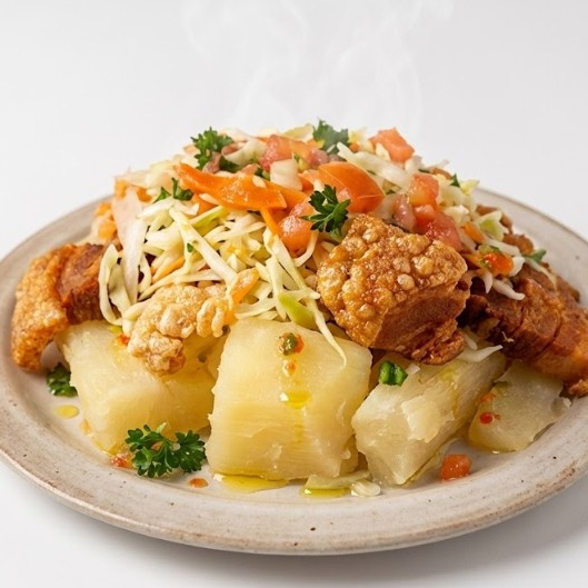 Yuca con chicharrón y ensalada.