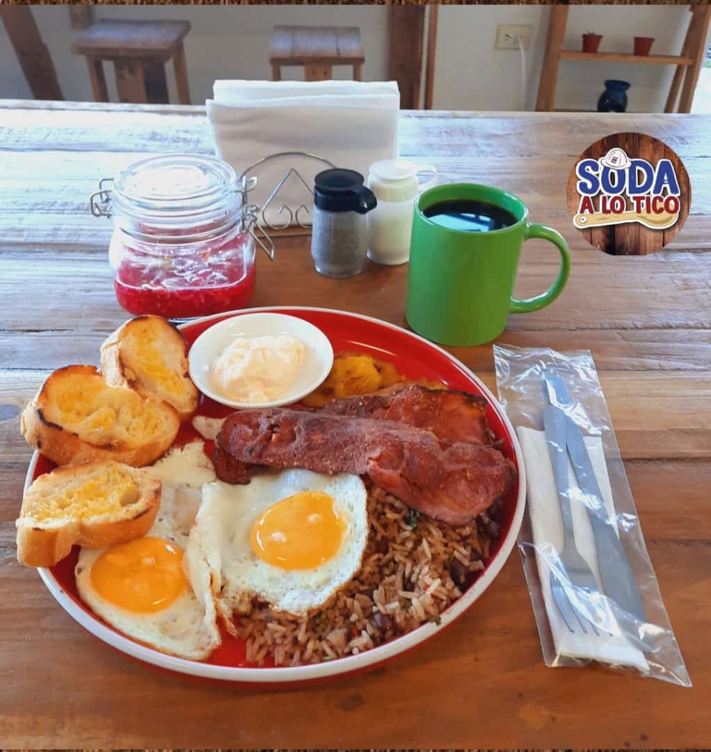 Le incluye 125g de pinto, 1 huevo, maduros, carne a eleccion, 2 tostadas, y viene acompañado de cafe o refresco de naraja