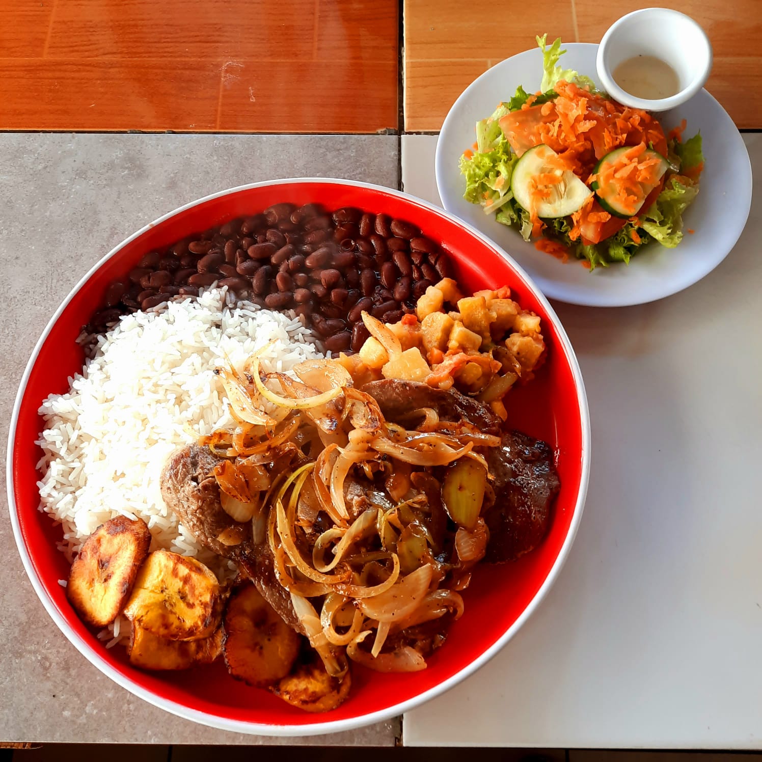 Delicioso casado con arroz, frijoles, ensalada, maduro, picadillo y DOBLE PORCIÓN... de bistec, pollo, chuleta, pescado, carne en salsa o pollo en salsa