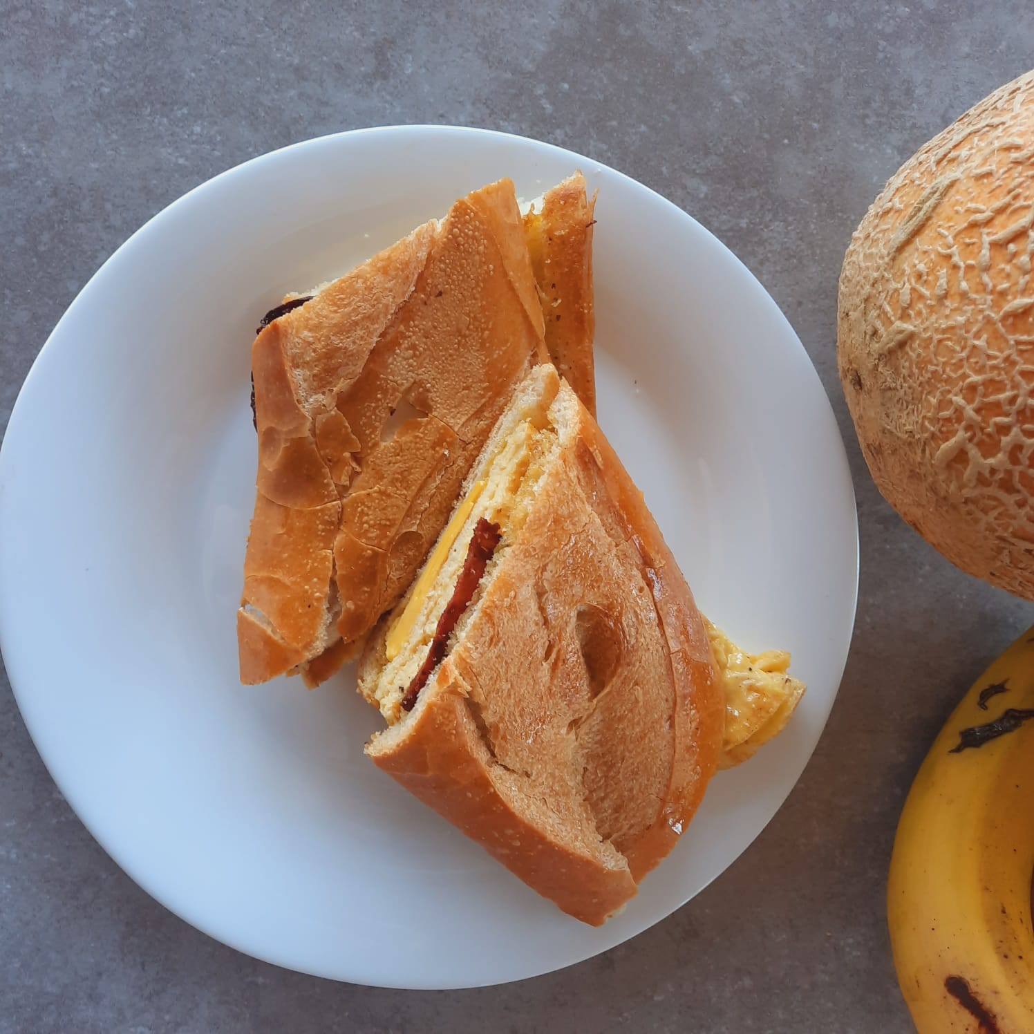 Pan baguette, 2 huevos en torta, queso amarillo y la opción de jamón o tocino, acompañado de café o jugo de naranja.