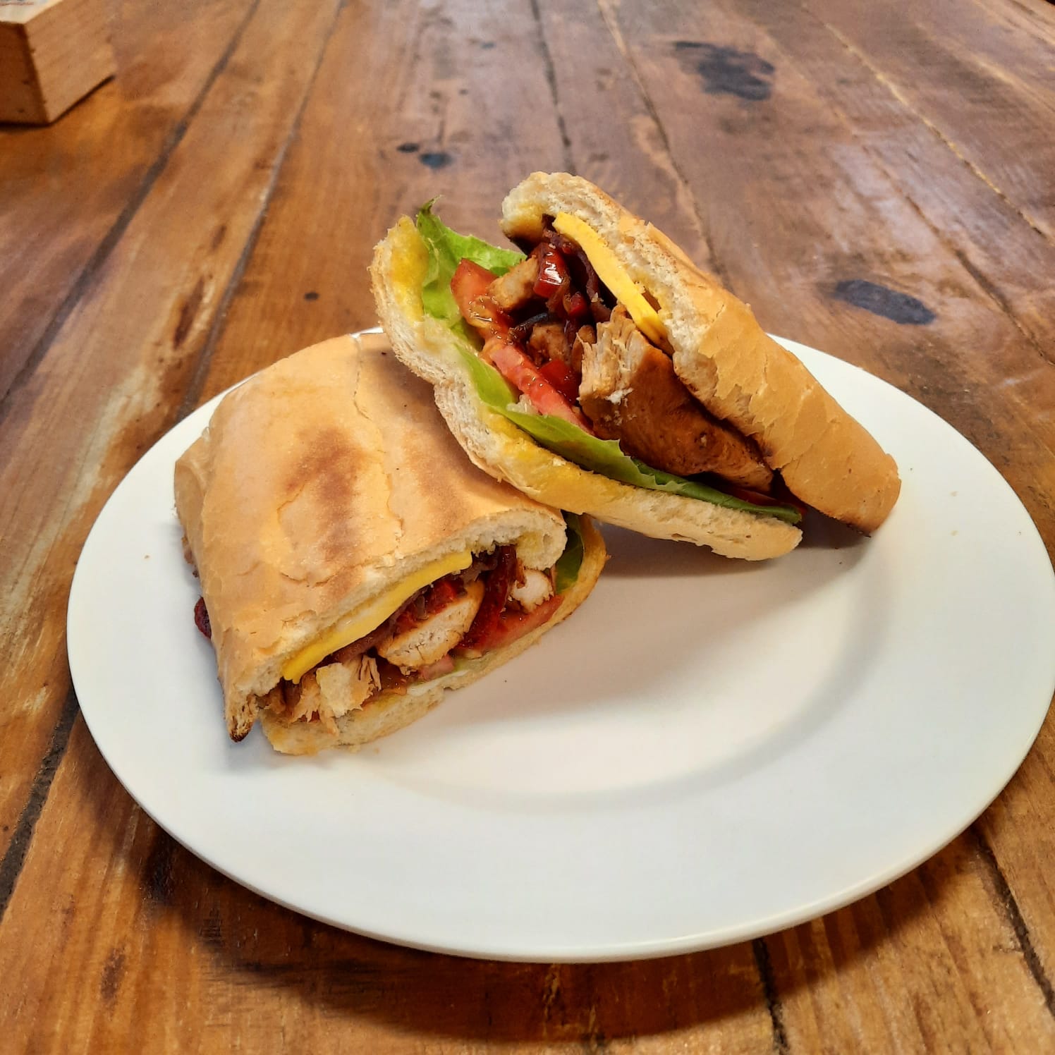 Pechuga de pollo empanizada y frita con lechuga, tomate, queso y salsa barbacoa.