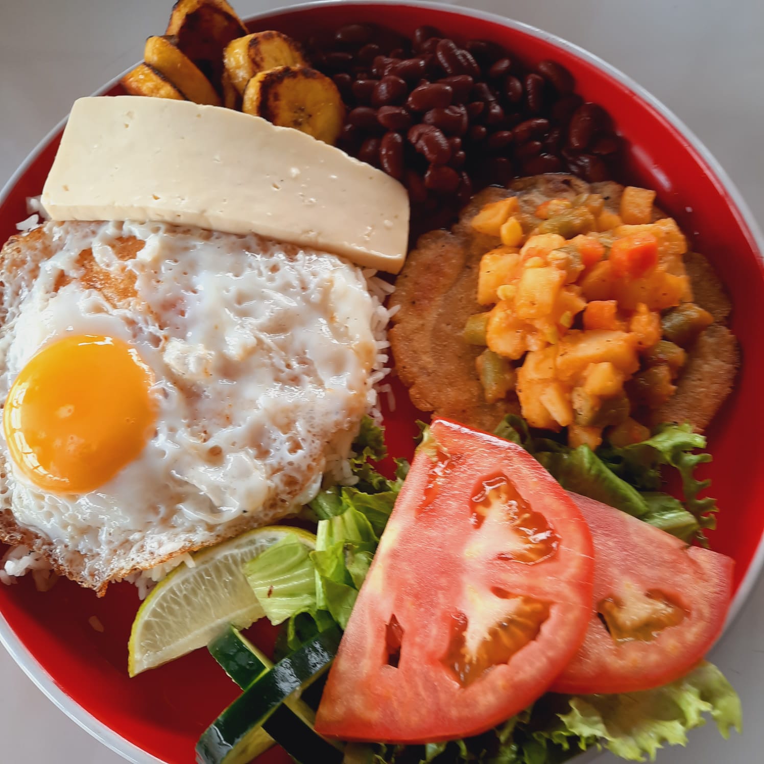 Arroz blanco con frijoles, ensalada, picadillo, maduros, queso, y huevo