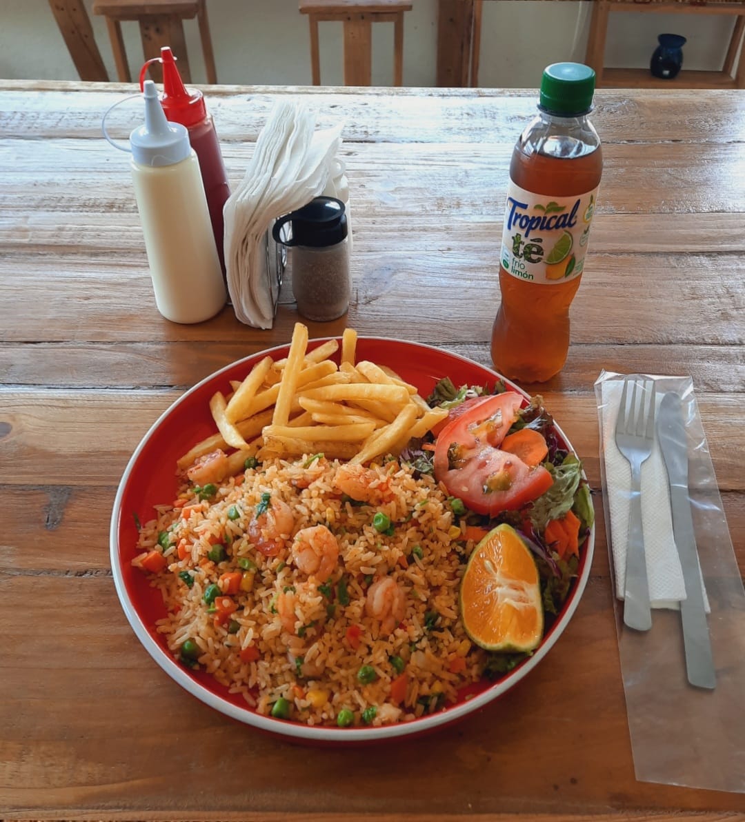 120 g de delicioso camarones en un delicioso arroz sofrito.. Acompañado de papas y ensalada.
