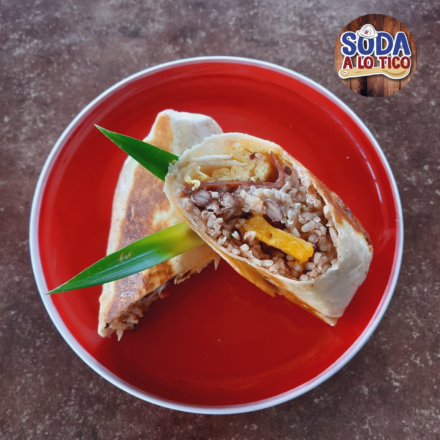 Nuestro delicioso gallo pinto con maduros,natilla, huevo y tocino, envuelto en una tortilla