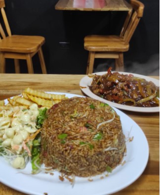 Arroz tipo Cantonés, Verduras, Camarones, Lomo, Lechon, Pollo, Jamon, Papas a la fraancesa, Chile Jalapeño, Cebollino y Frijol Nacido.