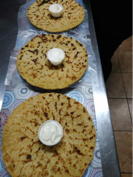 Empanada de maiz de carne, pollo, queso o frijol arreglada con lechga, repollo y salsa de tomate y mayonesa.