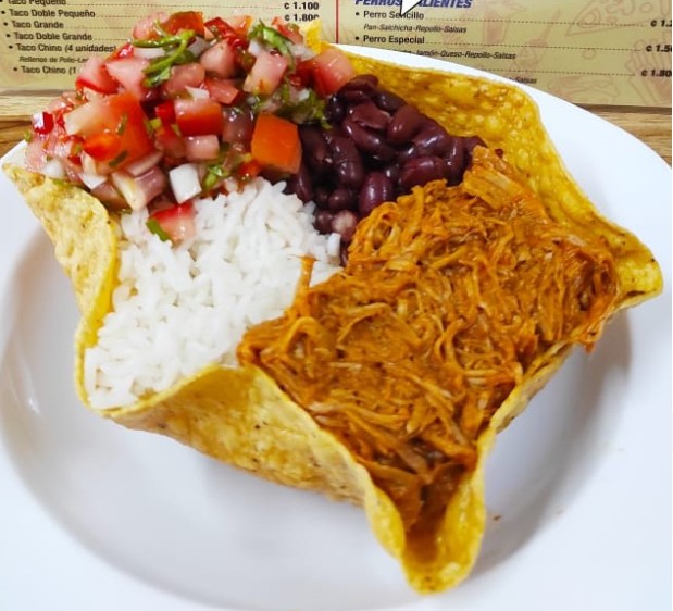 2 Tortillas de maíz, frijoles molidos, lechuga, repollo, carne o pollo, chimichurri y salsas.