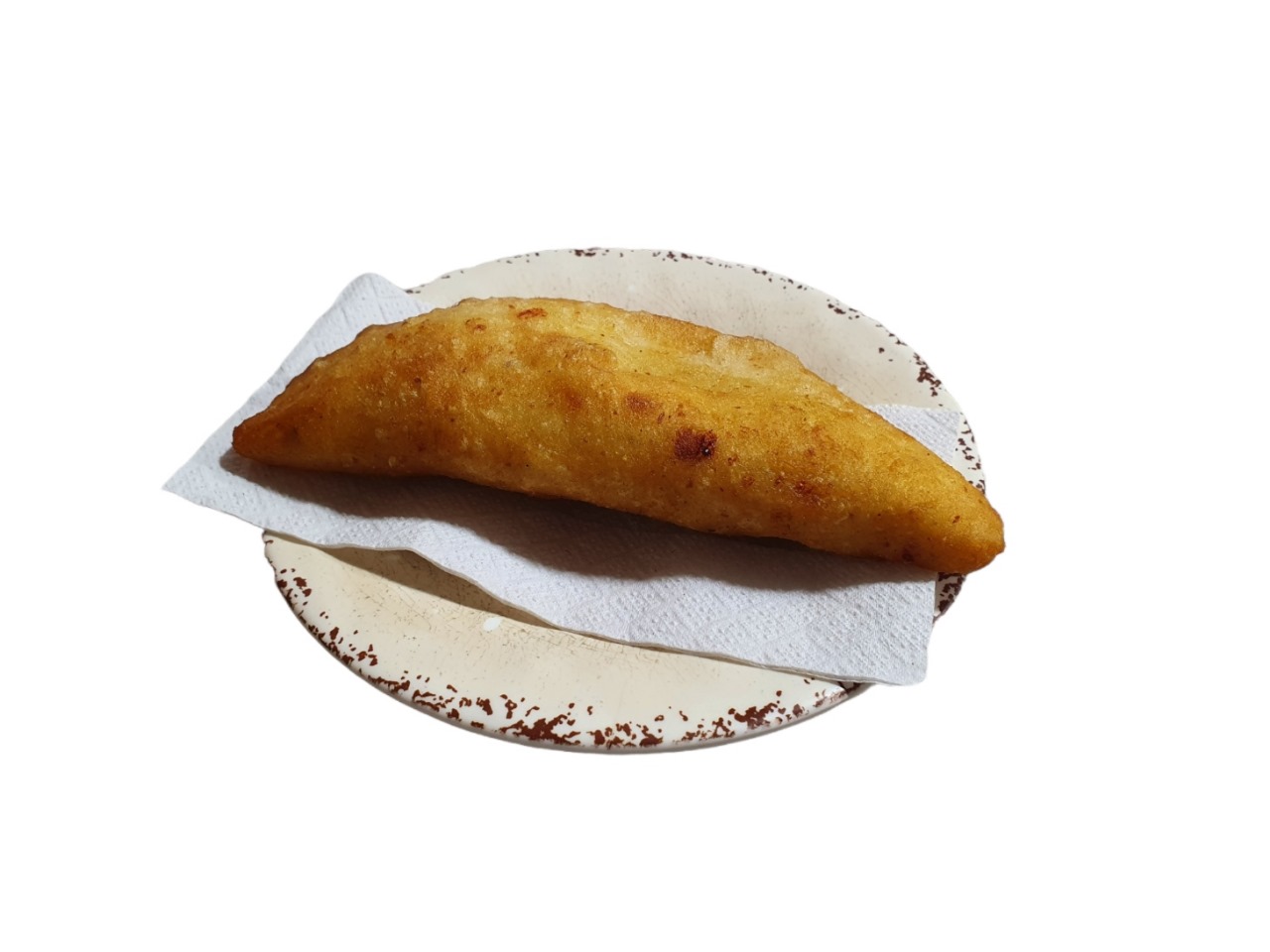 Pastel de carne (carne mechada o pollo mechado), lechuga, tomate, salsa de tomate, mayonesa y mostaza.
