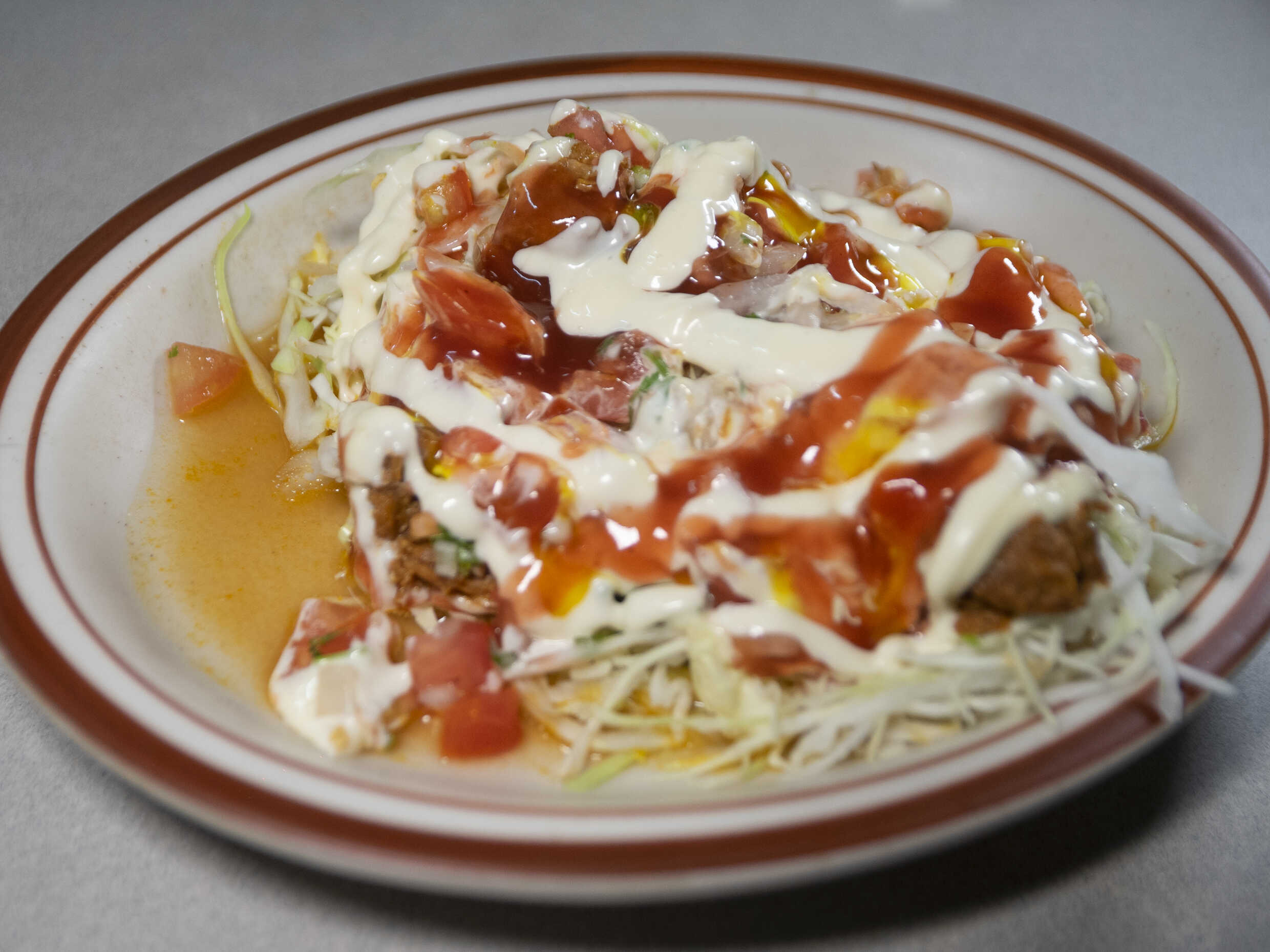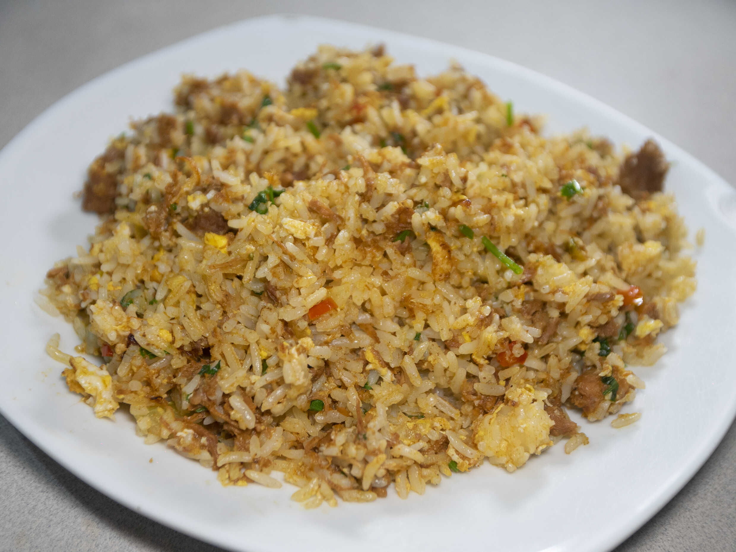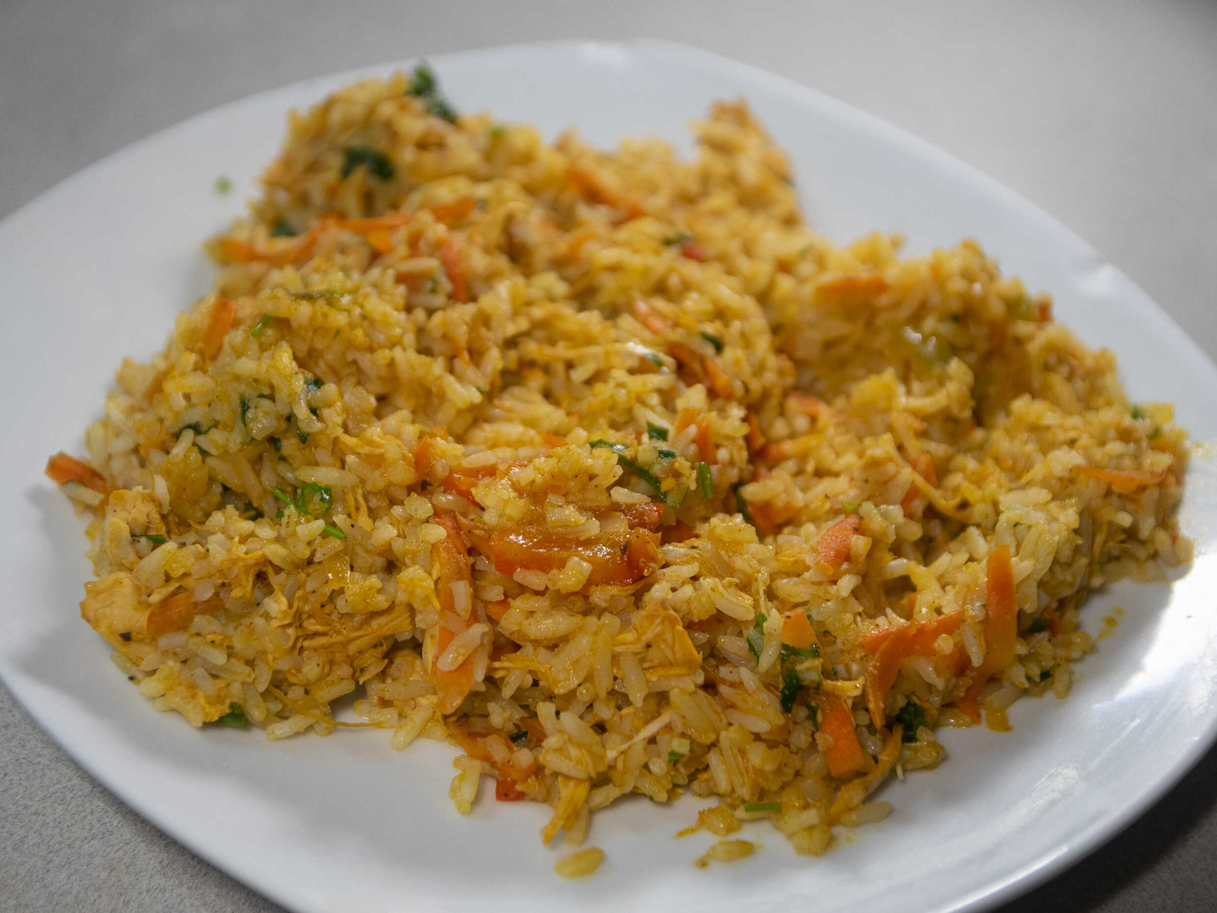 Arroz, pollo mechado, huevo, chile, cebolla.