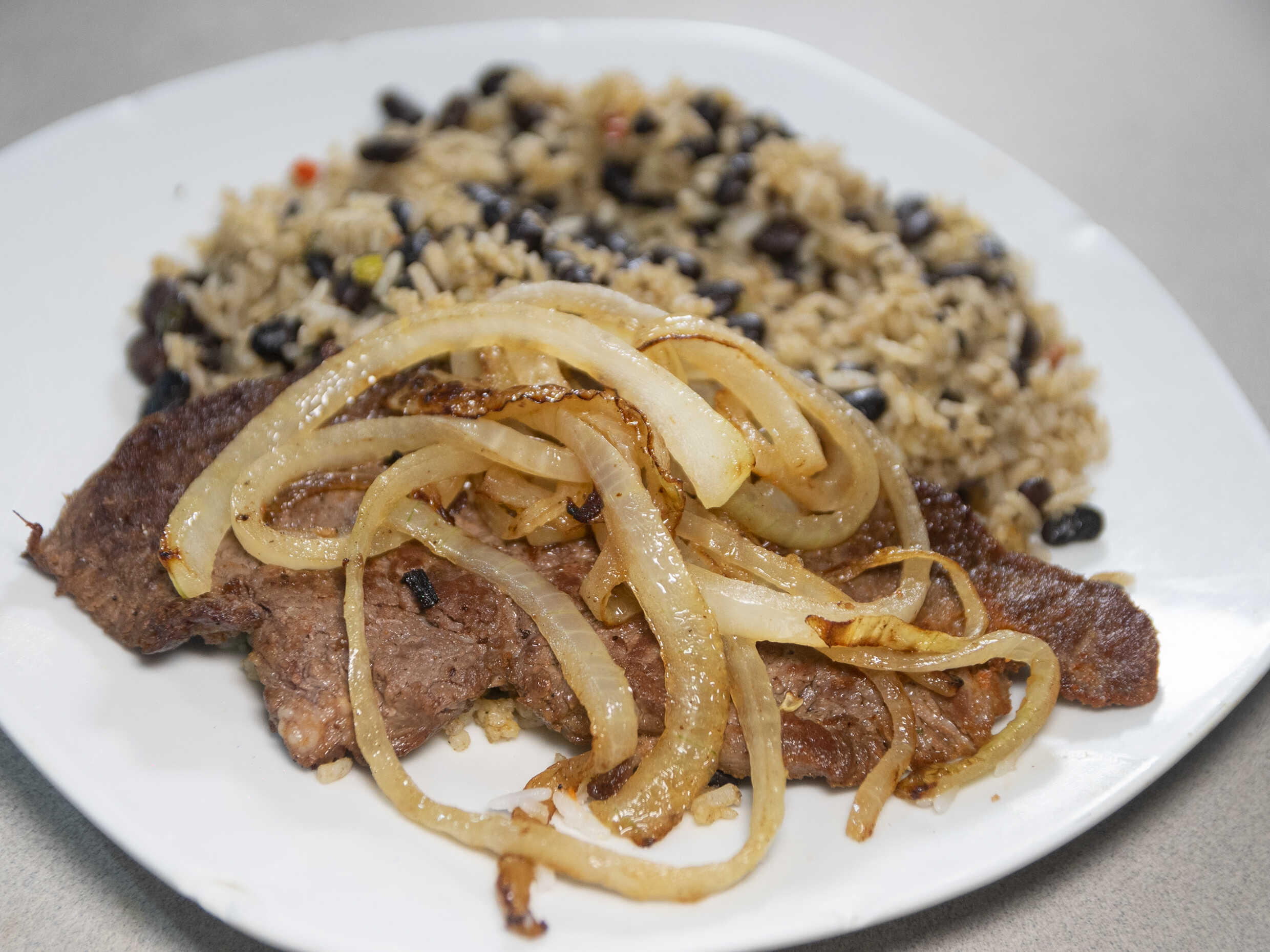 Acompañados de arroz, frijoles negros, chile, cebolla, culantro y proteína a elegir (Carne en salsa, pollo en salsa, pescado, etc....)