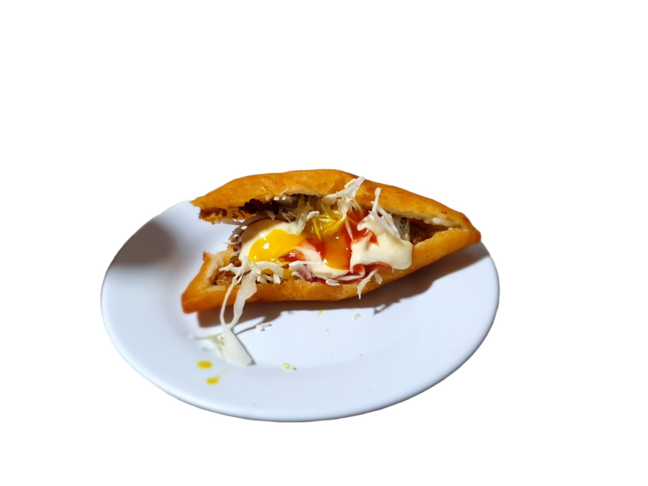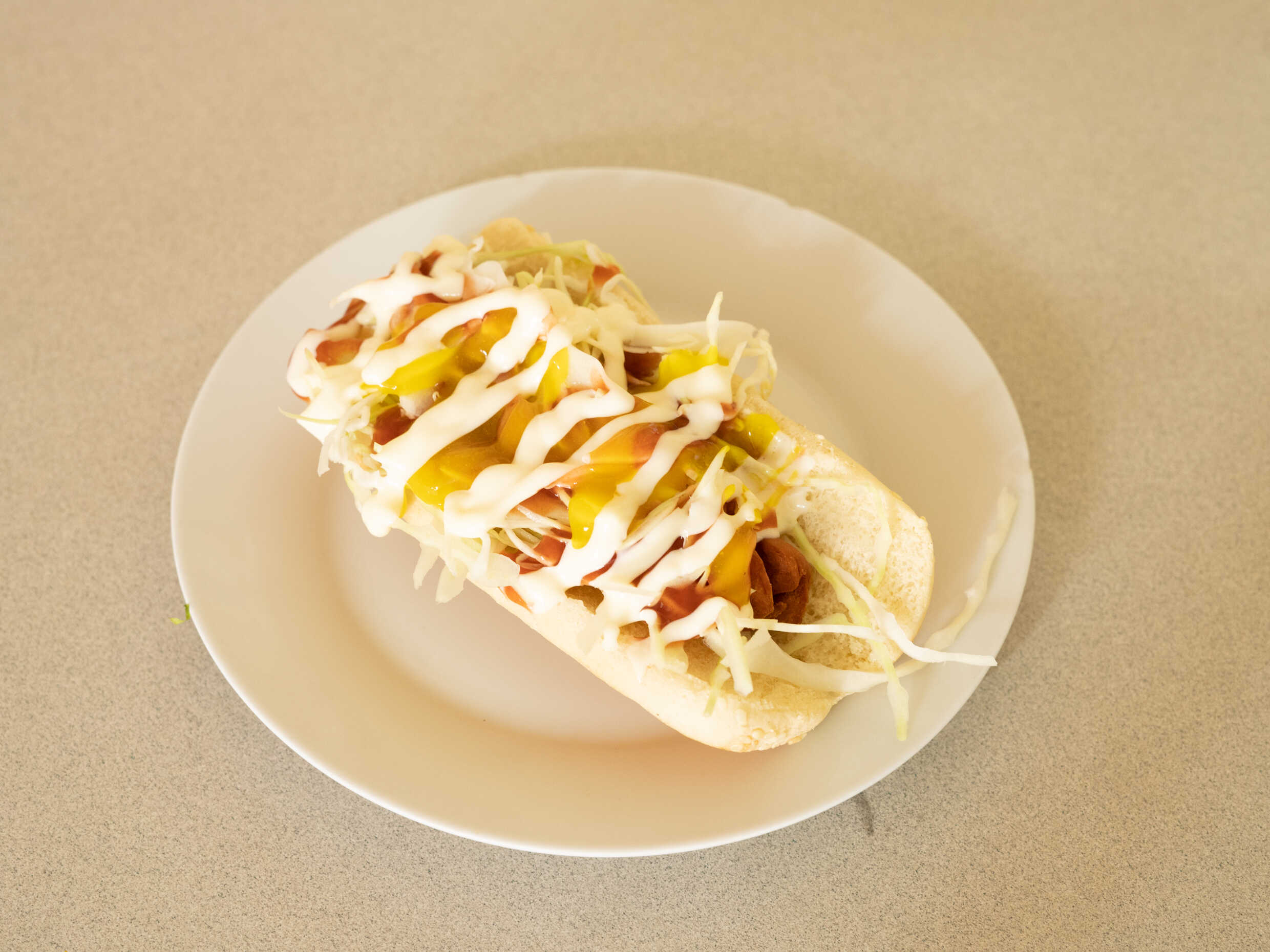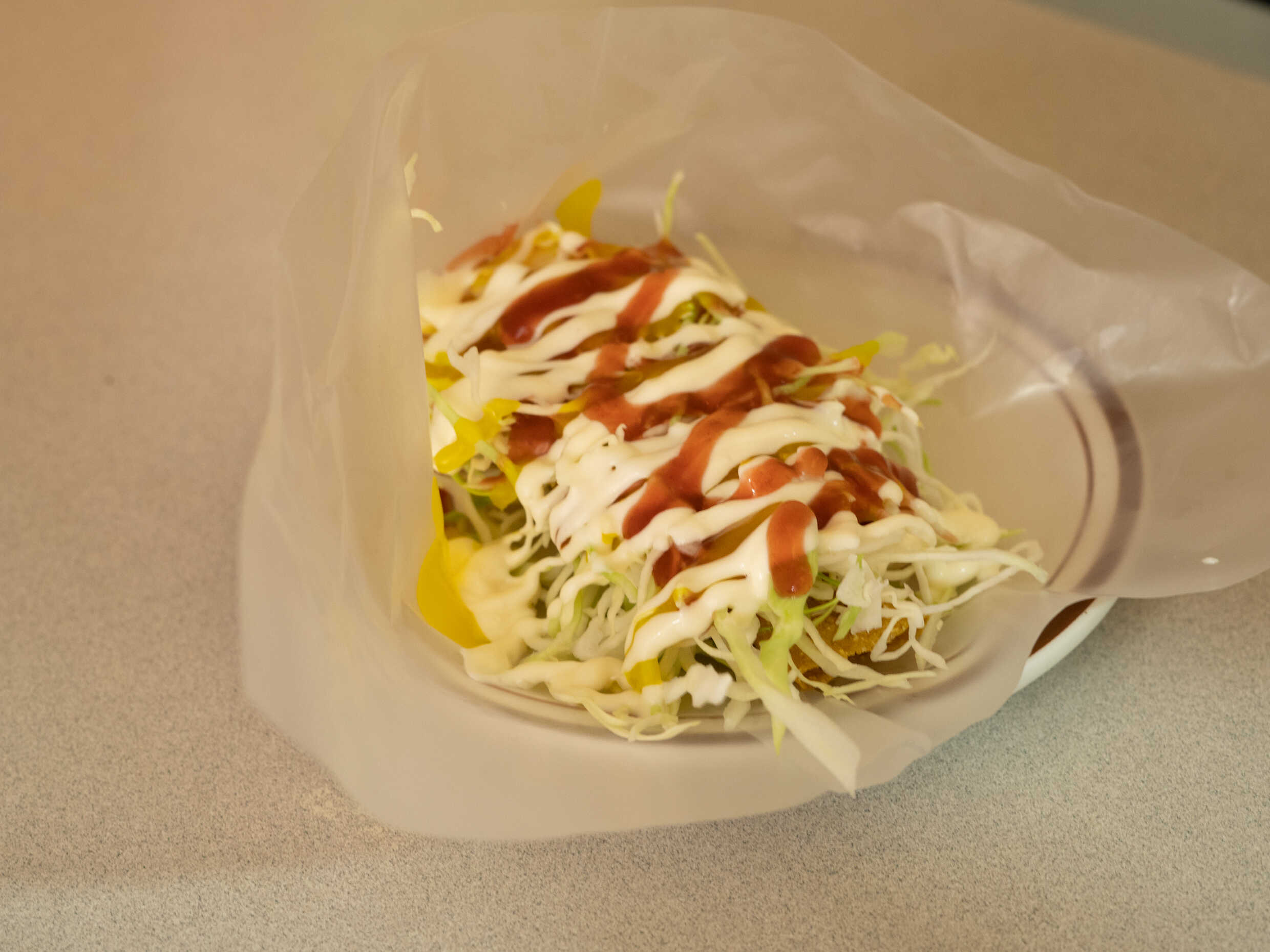 Torta de carne con tortilla, repollo, salsa de tomate, mayonesa y mostaza.