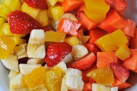 Fruta picada (piña, banano y papaya) acompañado de helado y gelatina.