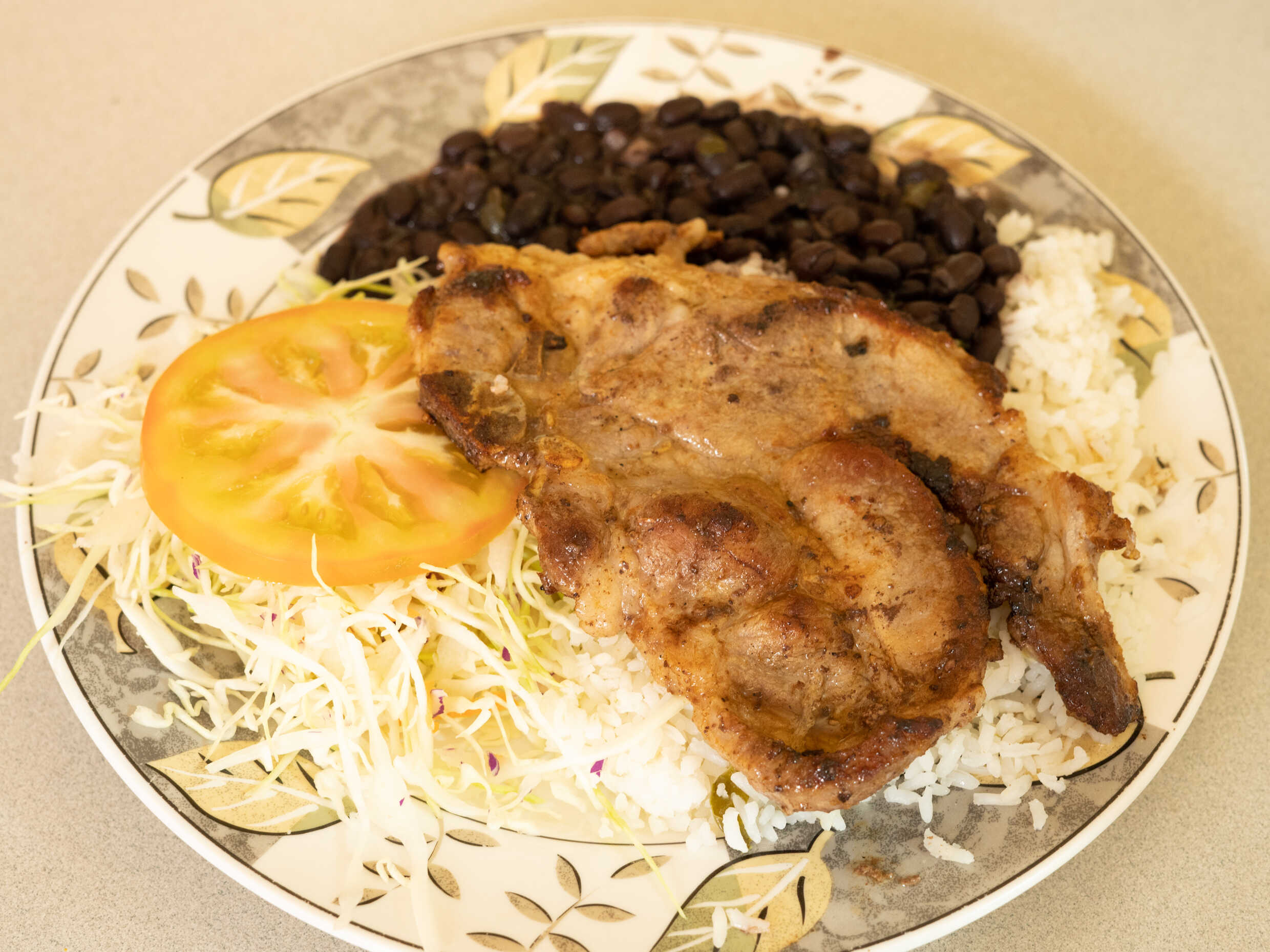 Proteína a elegir, arroz, frijoles y ensalada (lechuga, repollo o chimichurri).