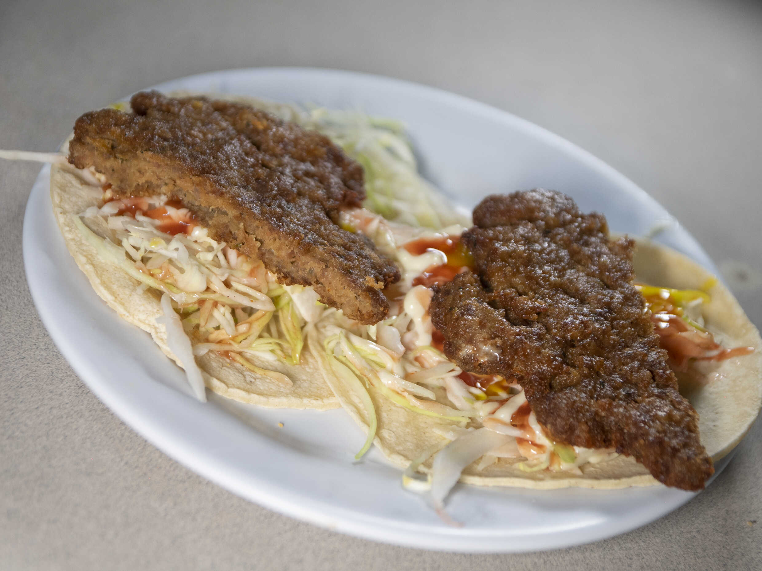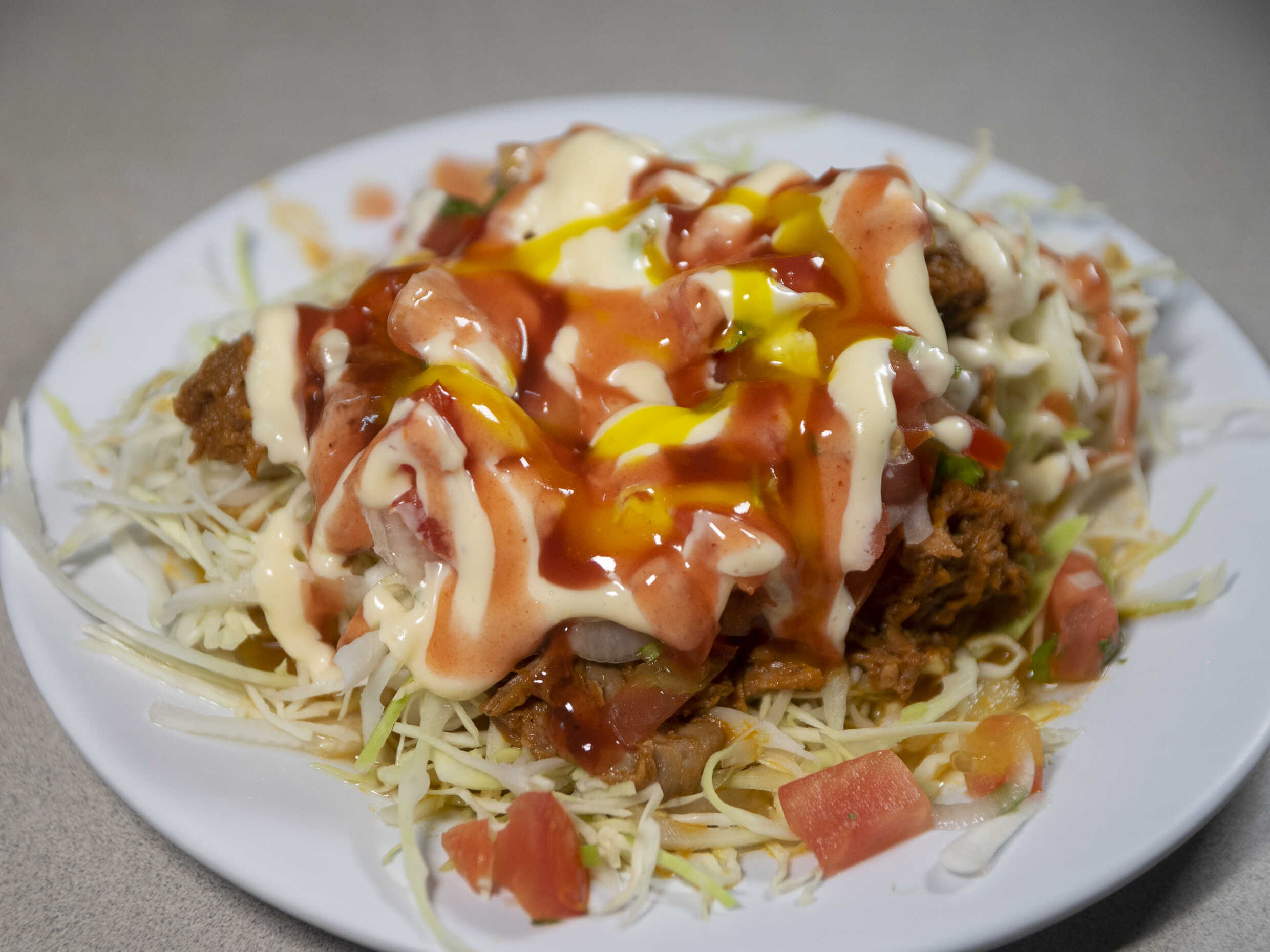 2 Tacos con repollo, carne mechada, chumichurri, salsa de tomate, mostaza y mayonesa.