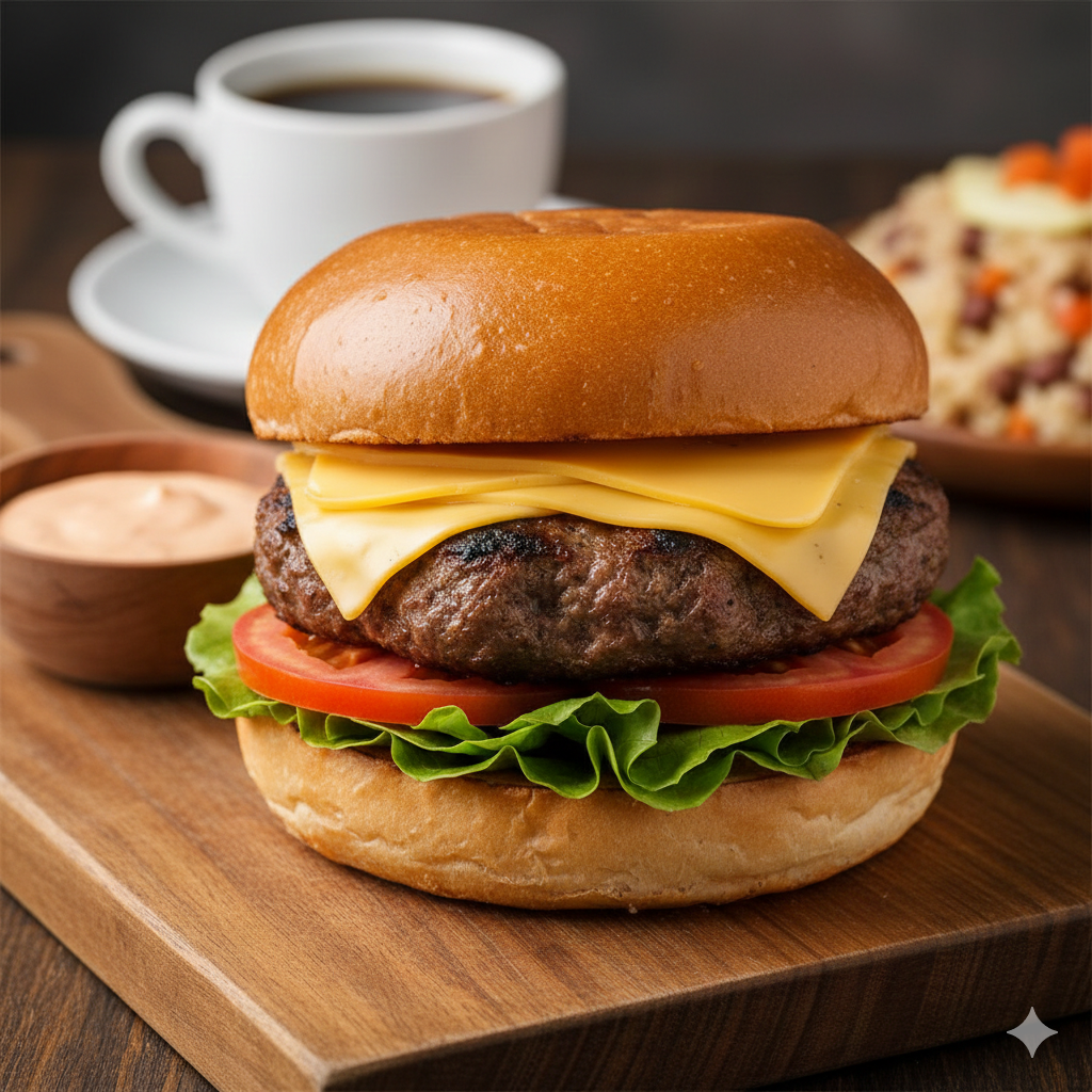 Lechuga, tomate, 2 tortas, pepinillo, queso amarillo y salsa de la casa.
