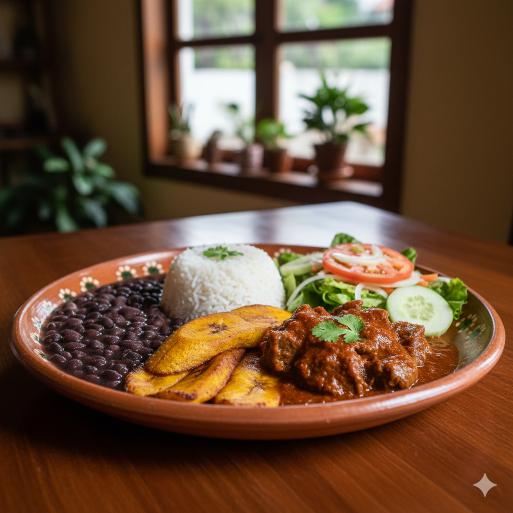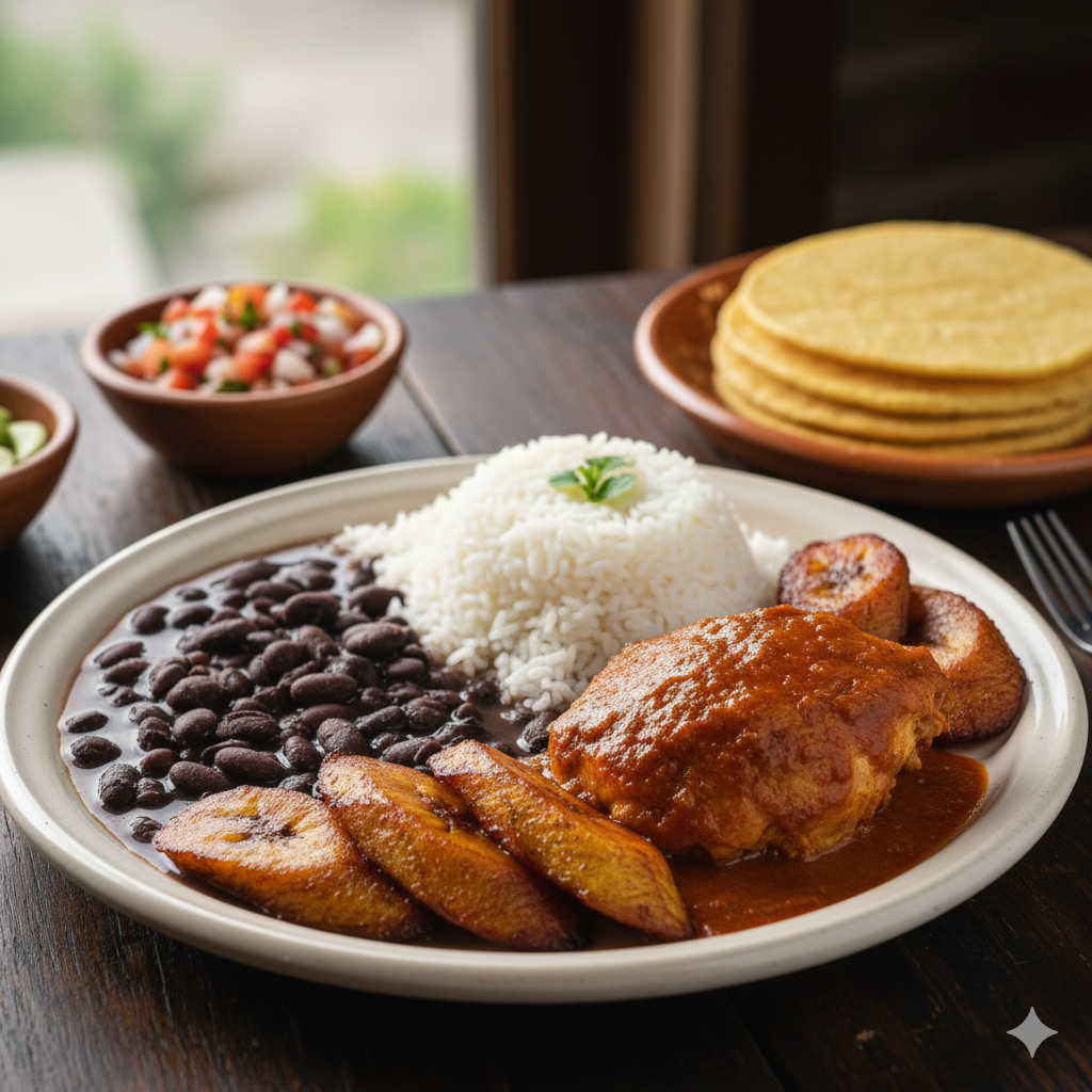 Arroz, frijoles, plátano maduro y pollo en salsa.