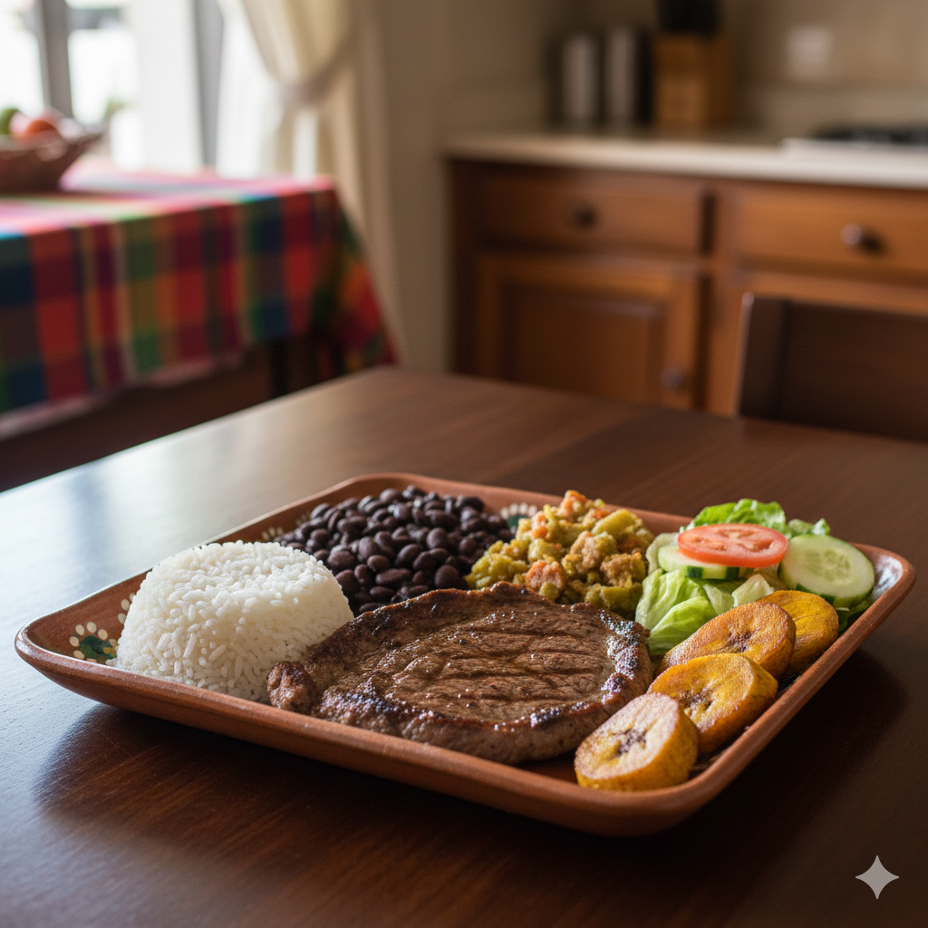 Arroz, frijoles, plátano maduro, ensalada, picadillo y bistec.