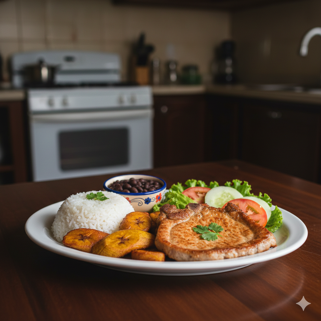Arroz, frijoles, plátano maduro, ensalada y chuleta.