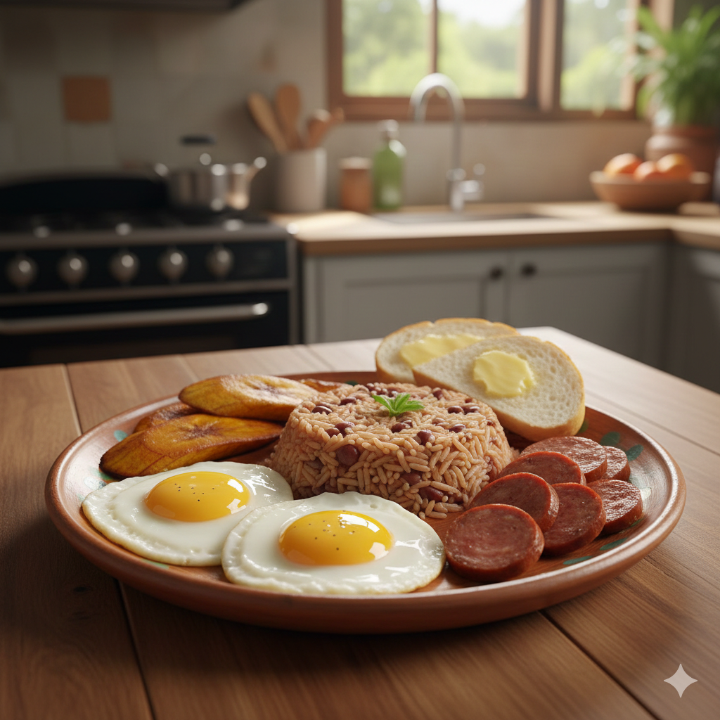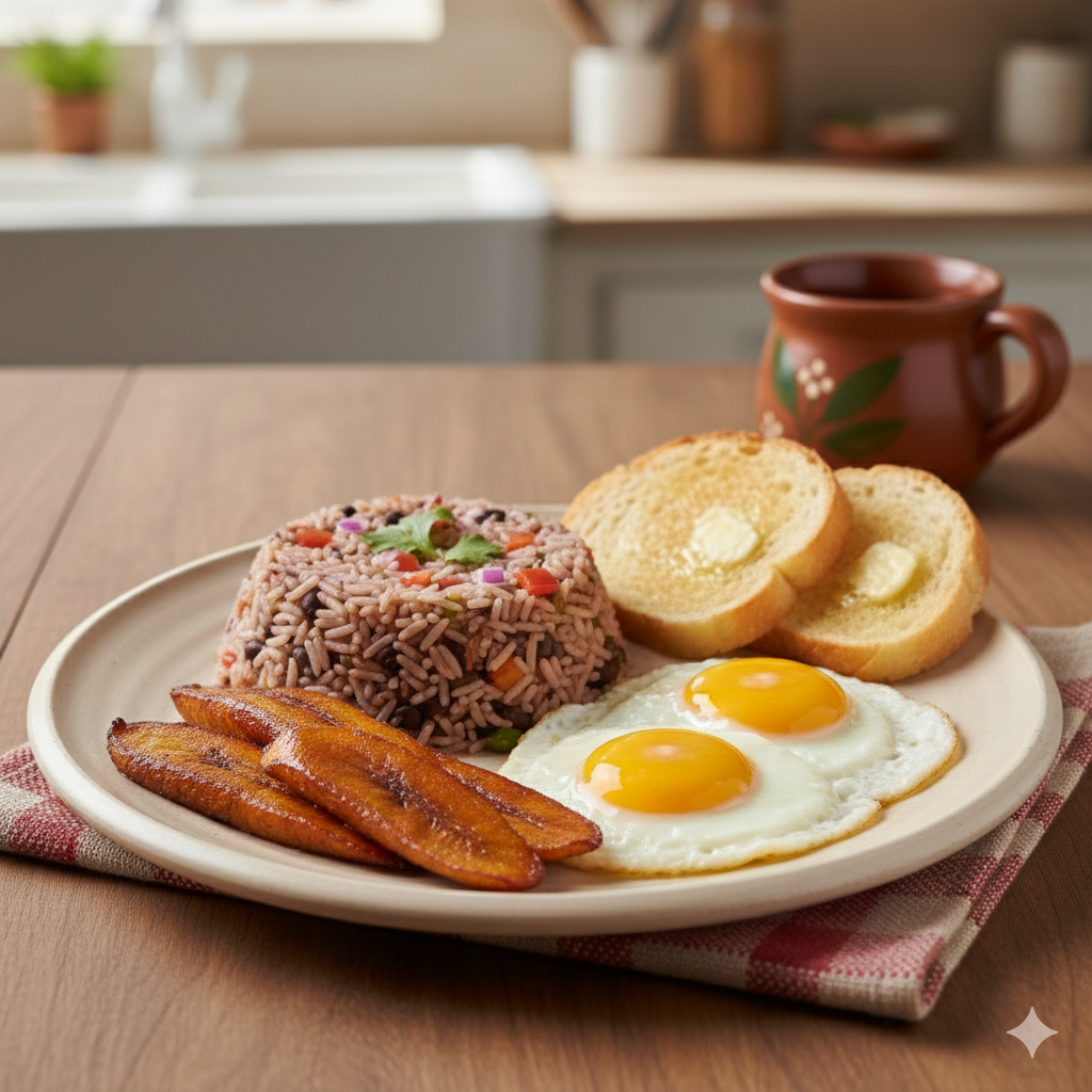 Pinto, huevo, plátano maduro y pan.