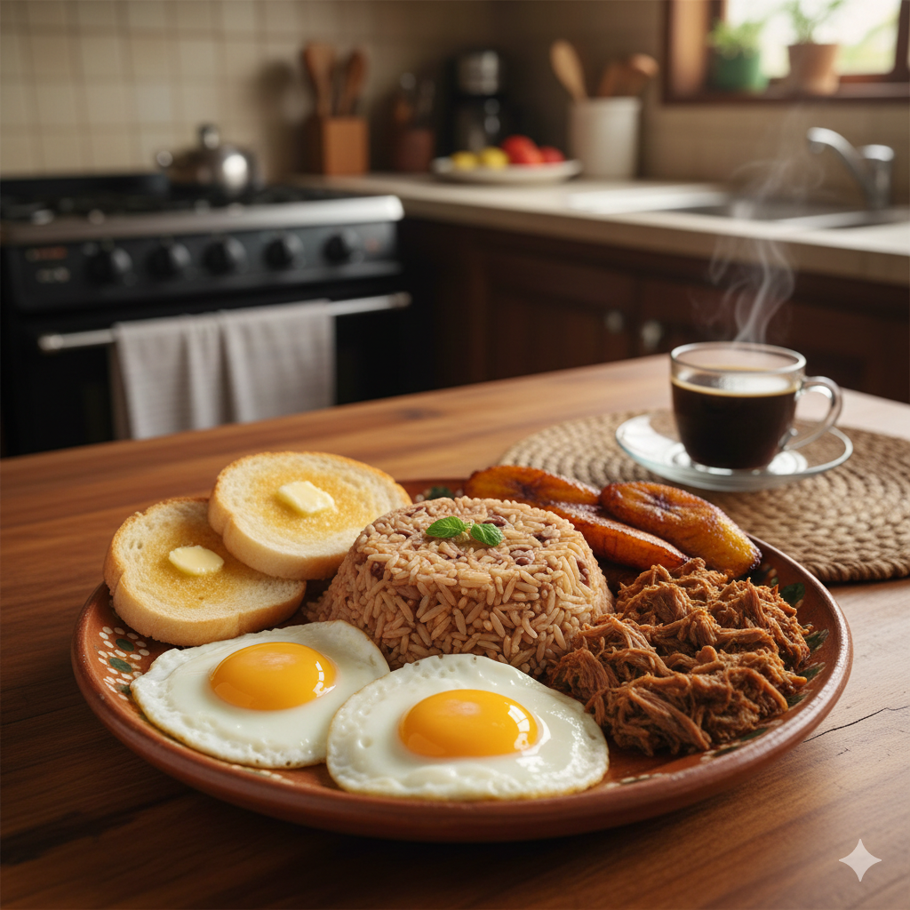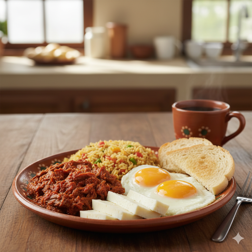 Pinto, carne mechada, plátano maduro, huevo y pan.