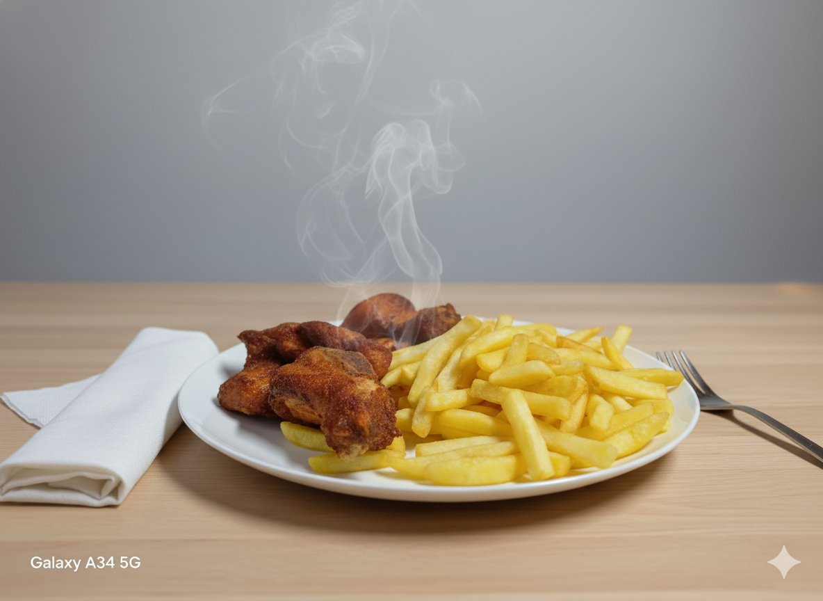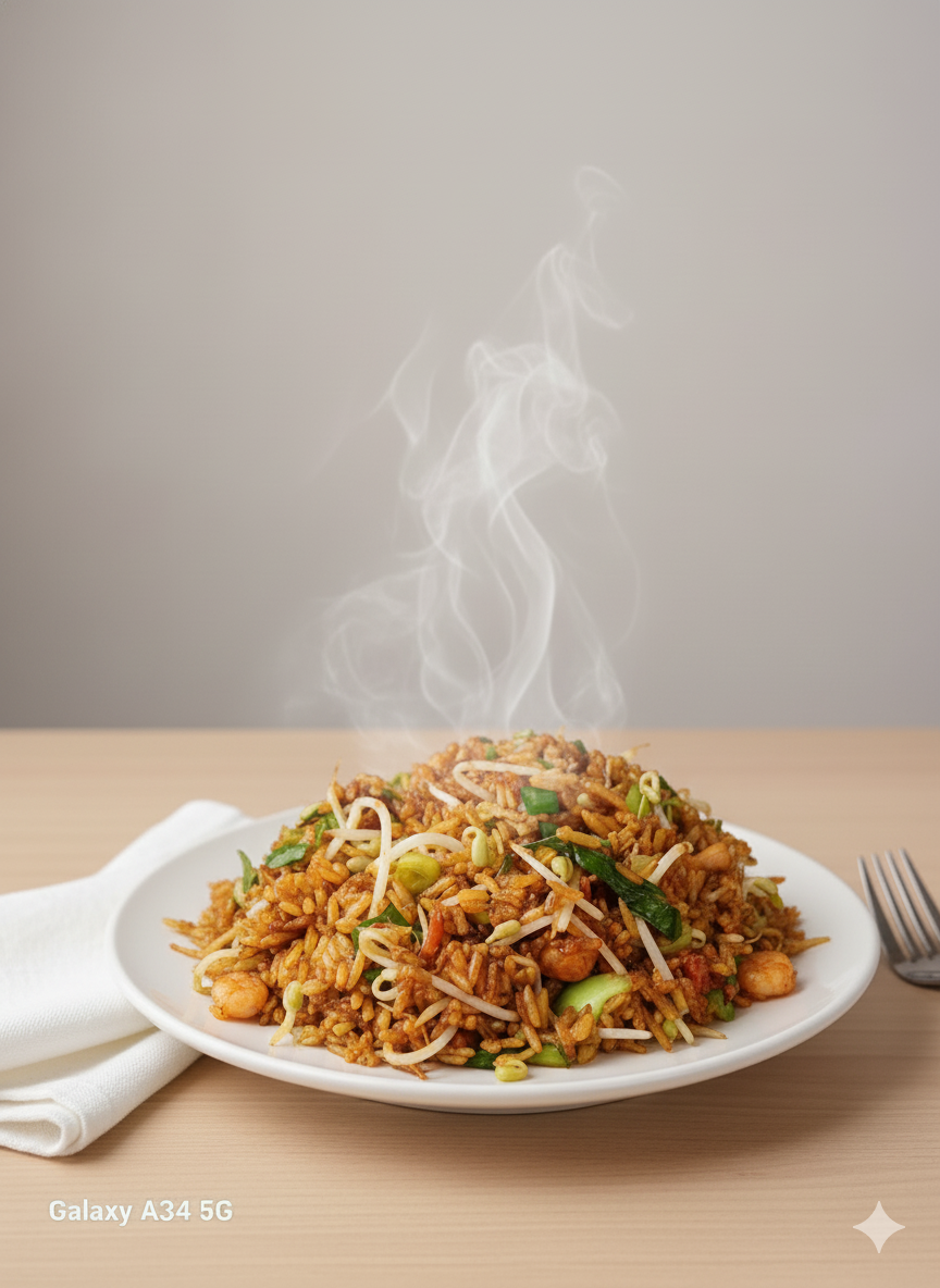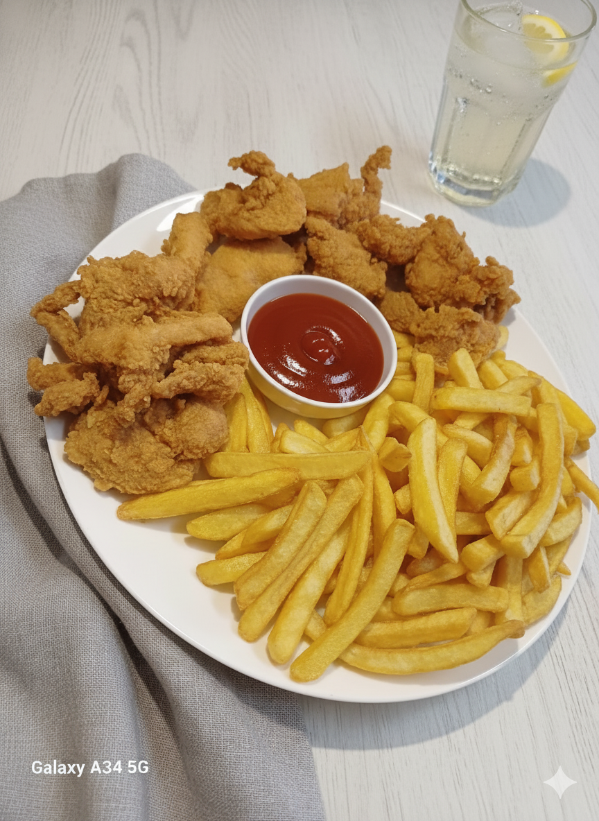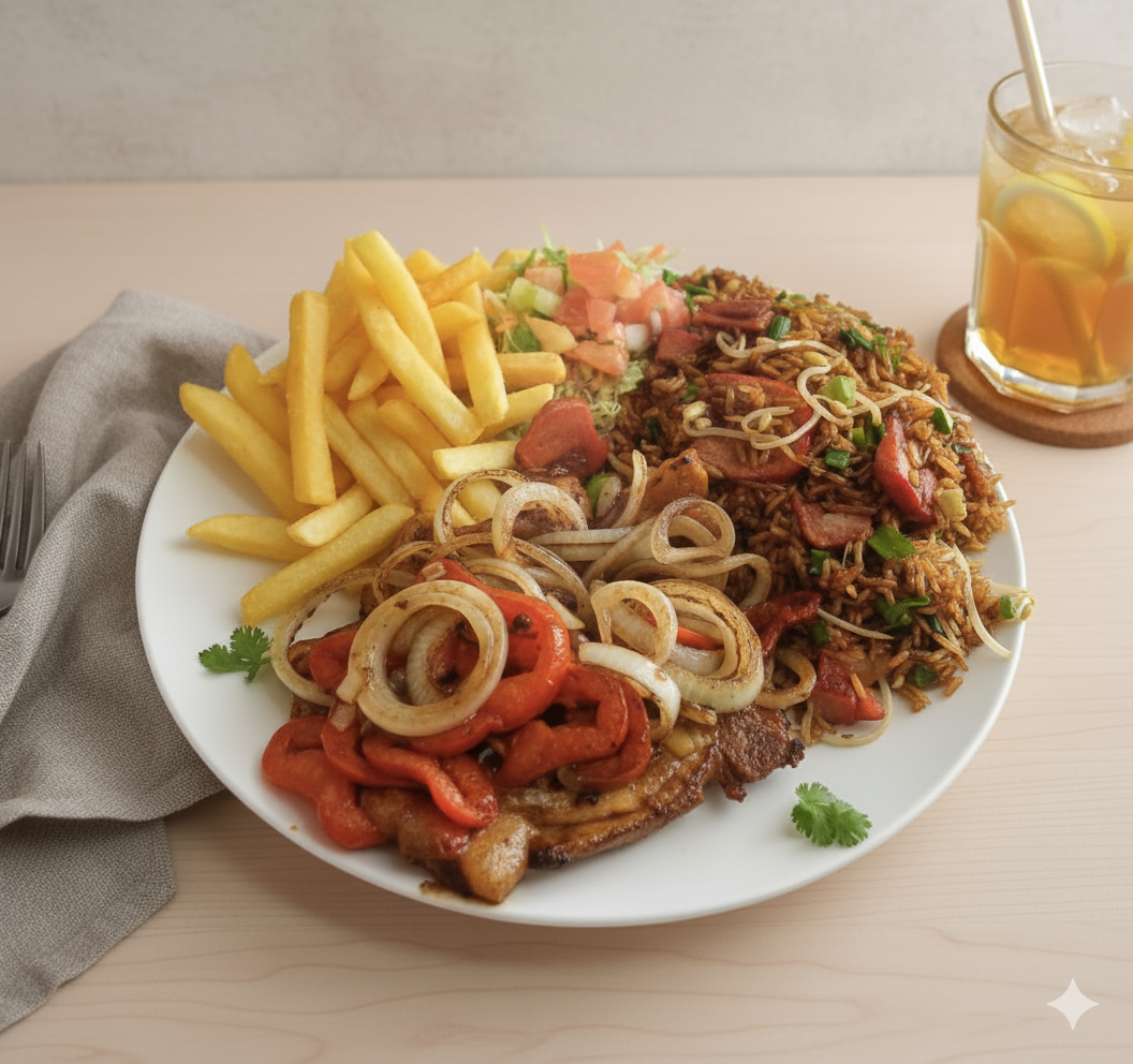 Delicioso combo de arroz con cantones, papas fritas, vegetales, proteína a escoger.