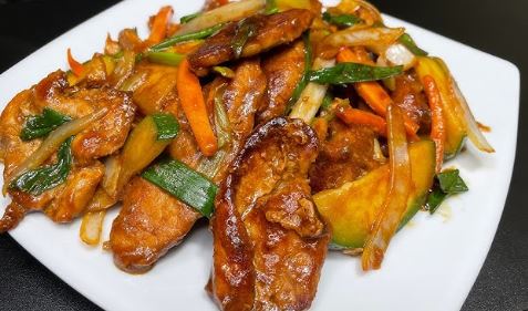 Delicioso chop suey con pollo, vegetales, jamón y repollo.