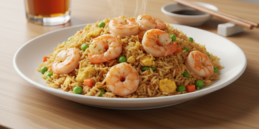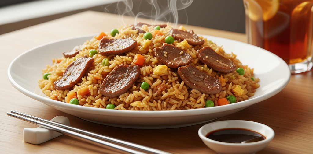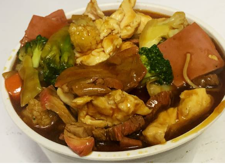 Delicioso chop suey con res y camarones, vegetales, jamón y repollo.