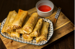 Deliciosos tacos chinos rellenos con zanahoria, repollo, cebolla con salsa agridulce.