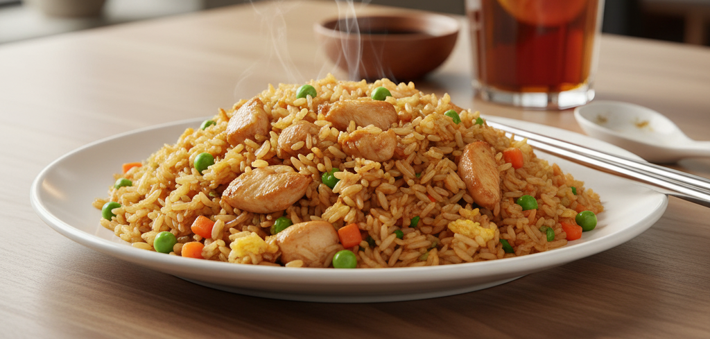 Delicioso arroz cantones con pollo, jamón, lechón y olores de la casa.