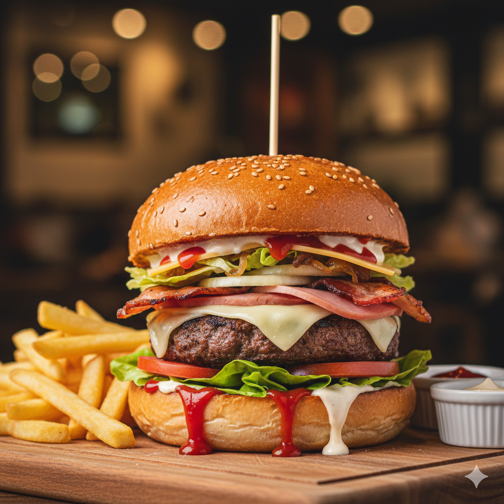 Pan artesanal, cebolla caramelizada, tocineta, torta de carne 150 g, jamón, queso americano, tomate, lechuga, salsa de tomate y mayonesa artesanal.