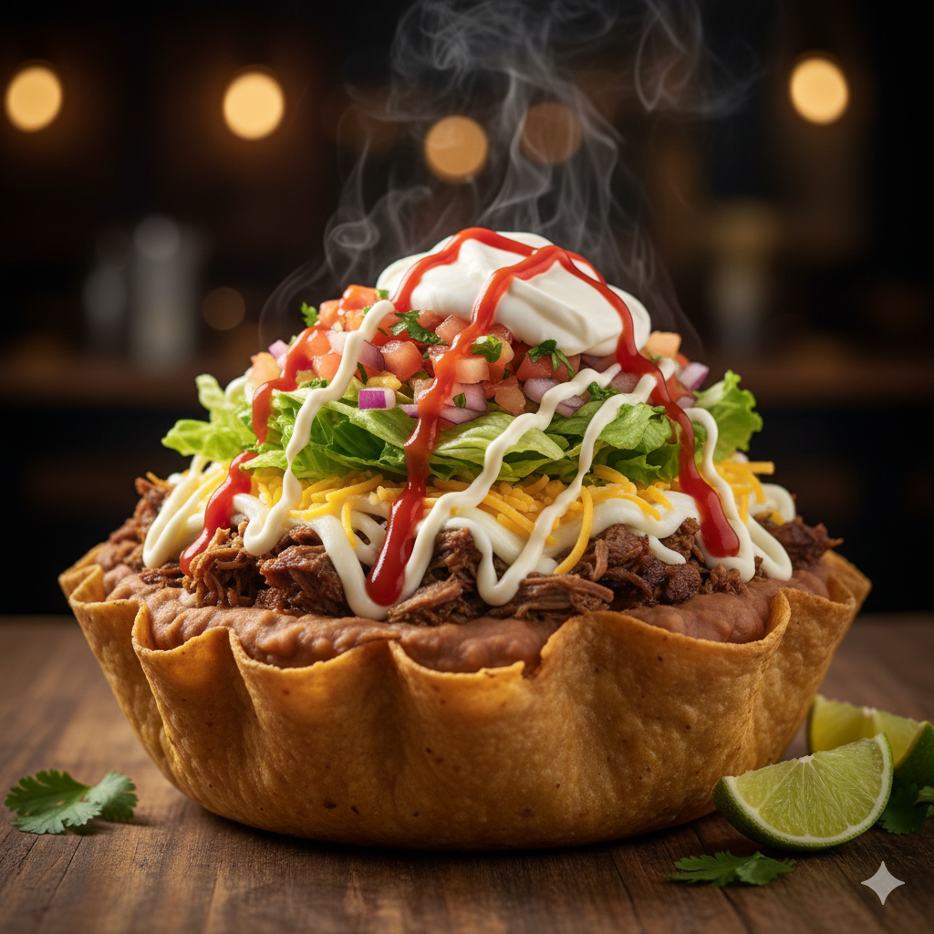 Canasta de tortilla de maíz, carne a elegir, frijoles molidos, queso mozzarella, lechuga, pico de gallo, natilla, salsa de tomate y mayonesa artesanal.