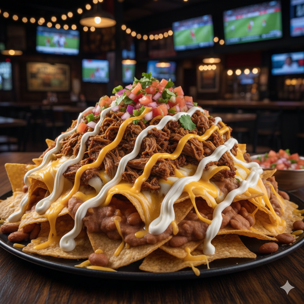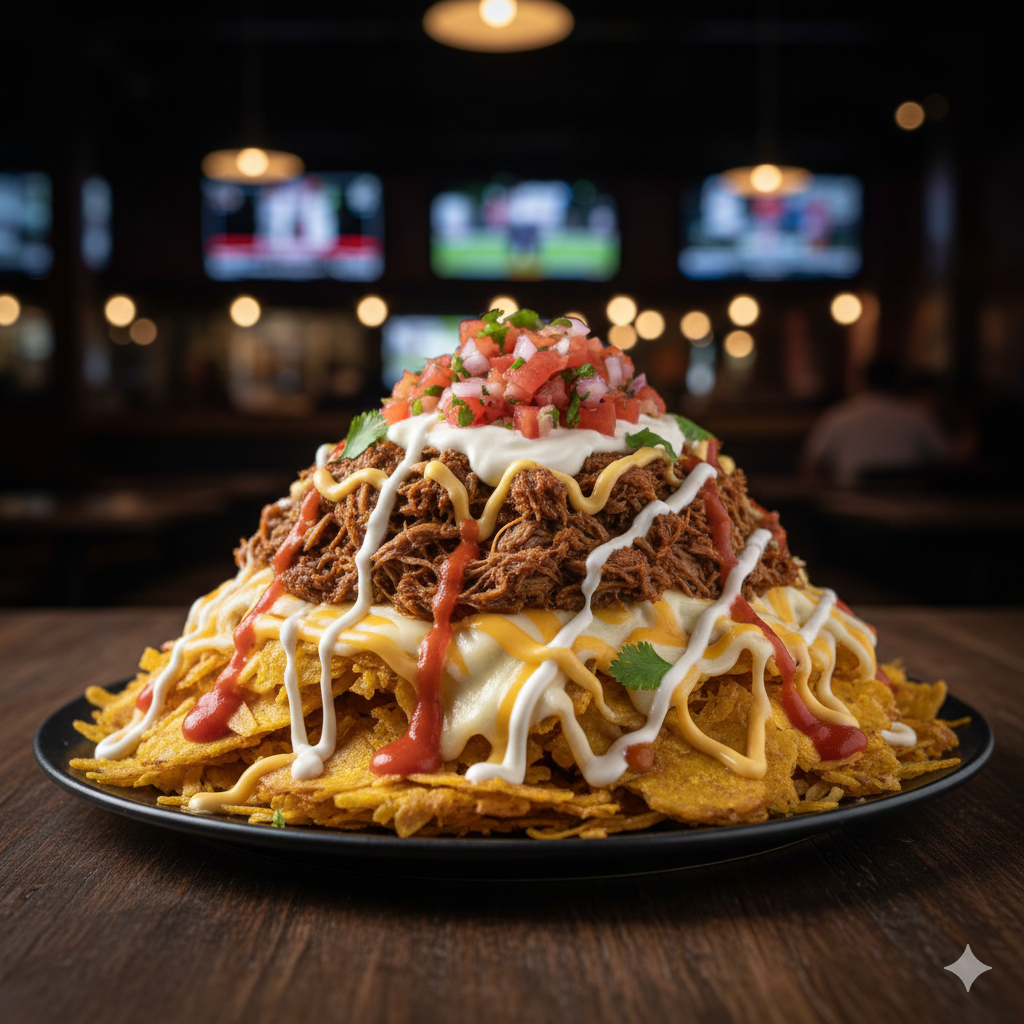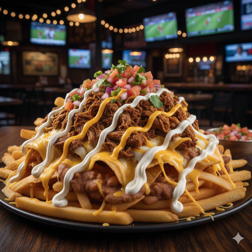 Papas fritas, carne mechada, queso mozzarella, queso cheddar, pico de gallo, natilla.