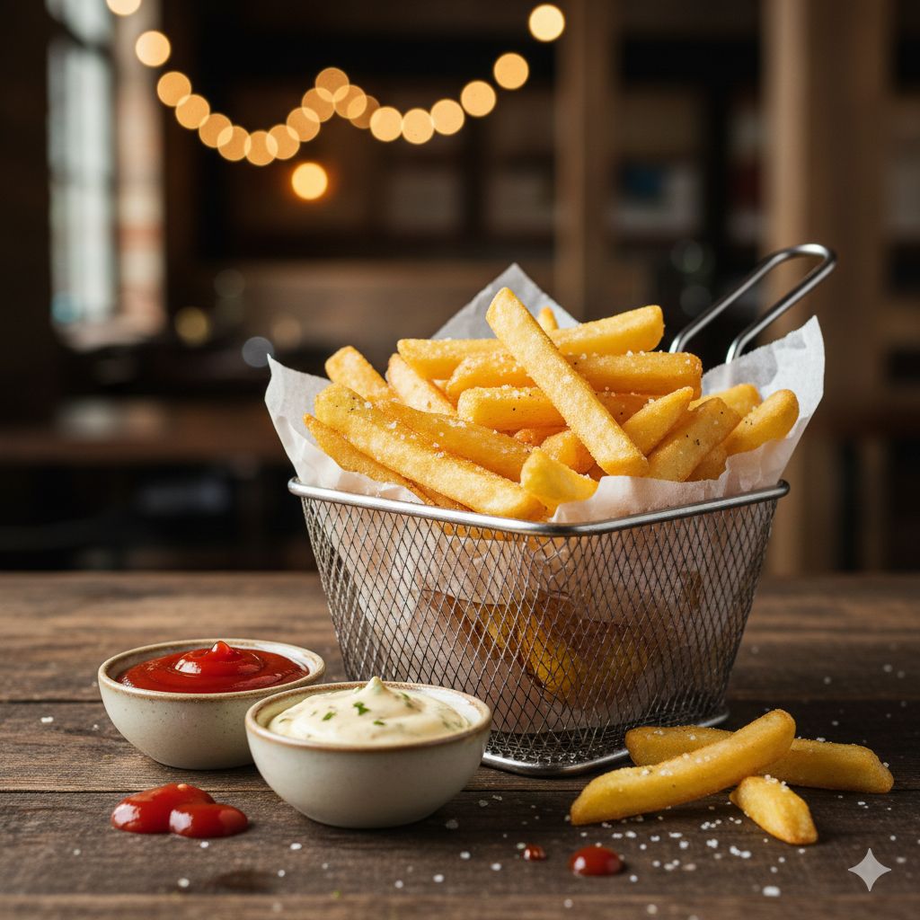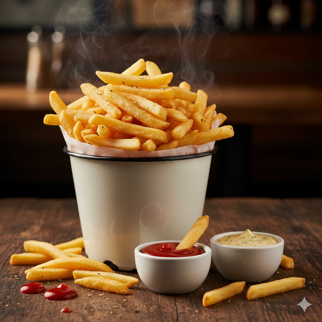 Papas a la francesa con salsa de tomate y mayonesa artesanal.