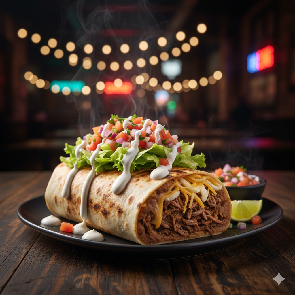 Tortilla de harina, frijoles molidos, carne a elegir, queso mozzarella y cheddar, con ensalada de lechuga, pico de gallo y natilla.