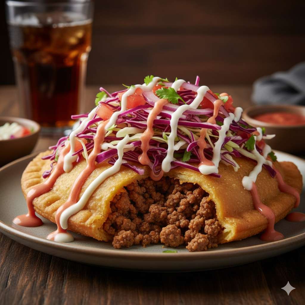 Tortilla de maíz, carne a elegir, frijoles molidos, queso mozzarella, queso cheddar, pico de gallo, natilla.