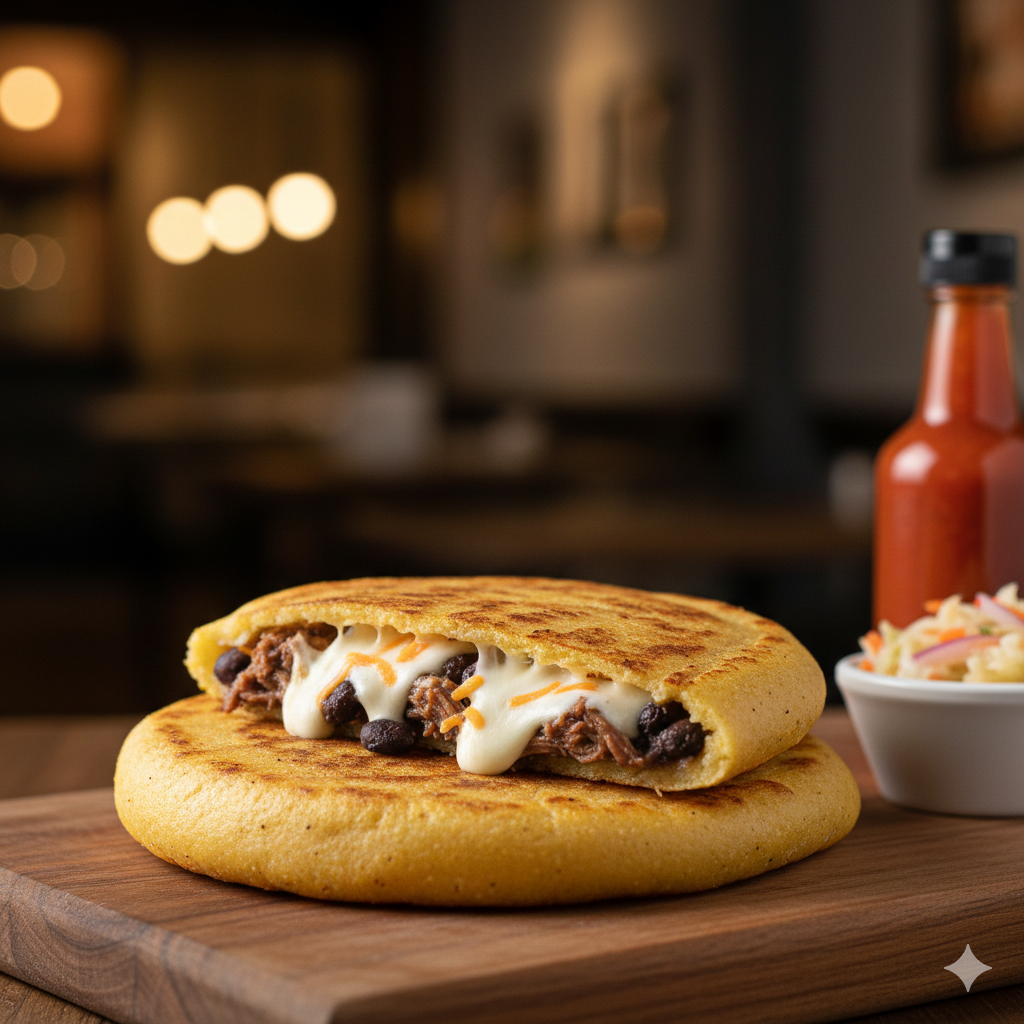 Masa de maíz, frijoles molidos, queso mozzarella, carne a elegir (con extras).