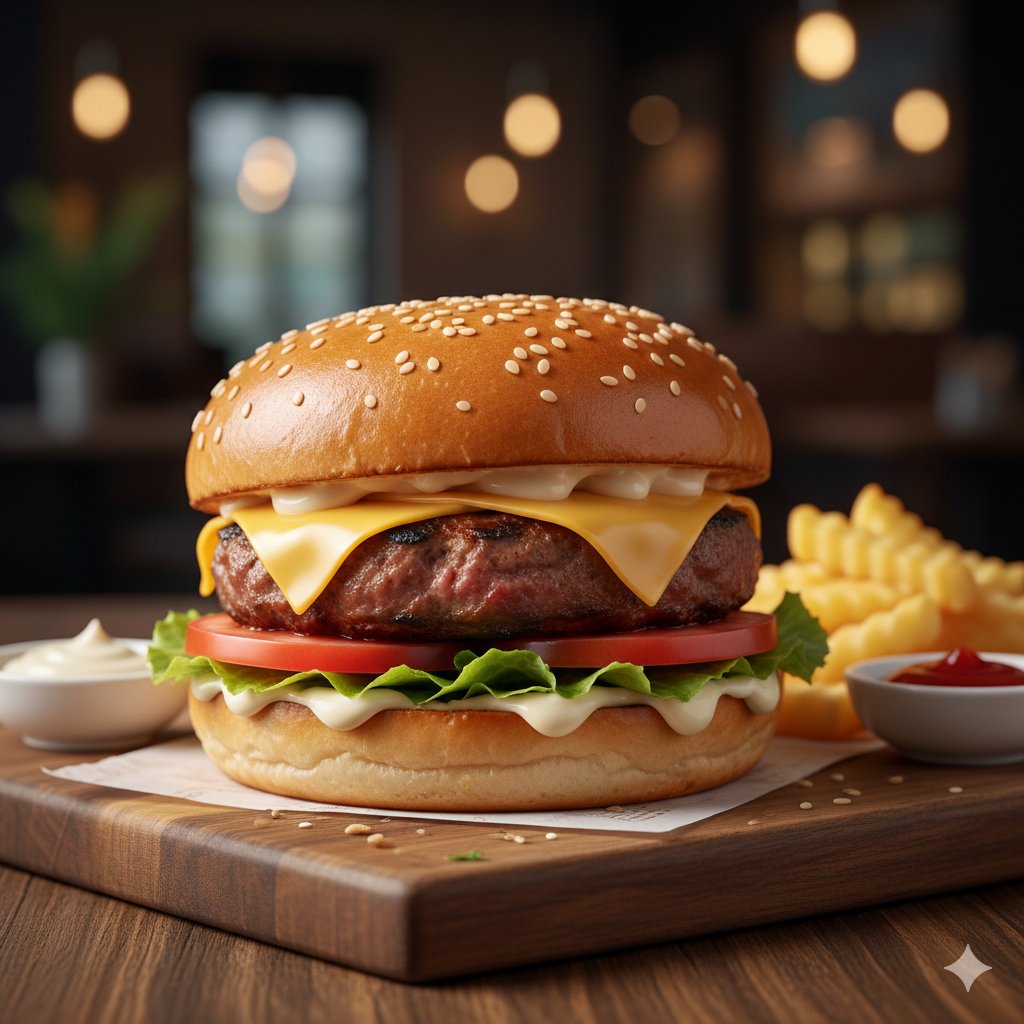 Pan, torta de carne 100 g, queso americano, lechuga, tomate y mayonesa artesanal.
