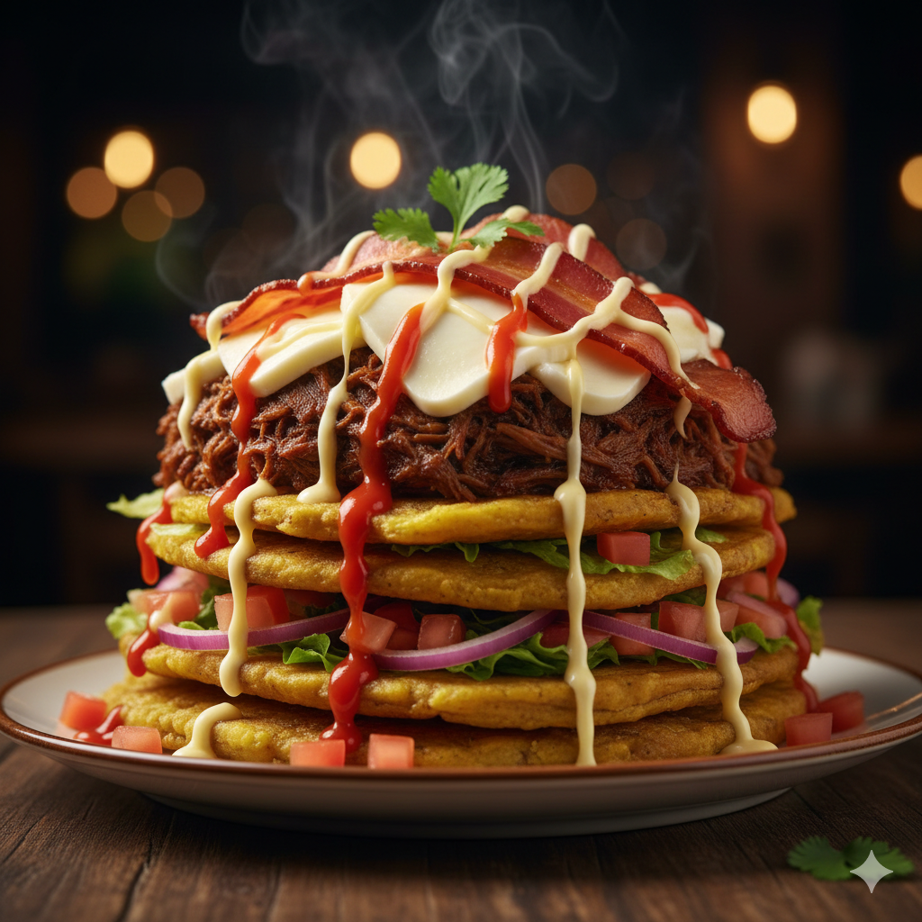 Patacones de plátano, carne mechada, queso mozzarella, tocineta, cebolla, tomate, lechuga, salsa de tomate y mayonesa artesanal.