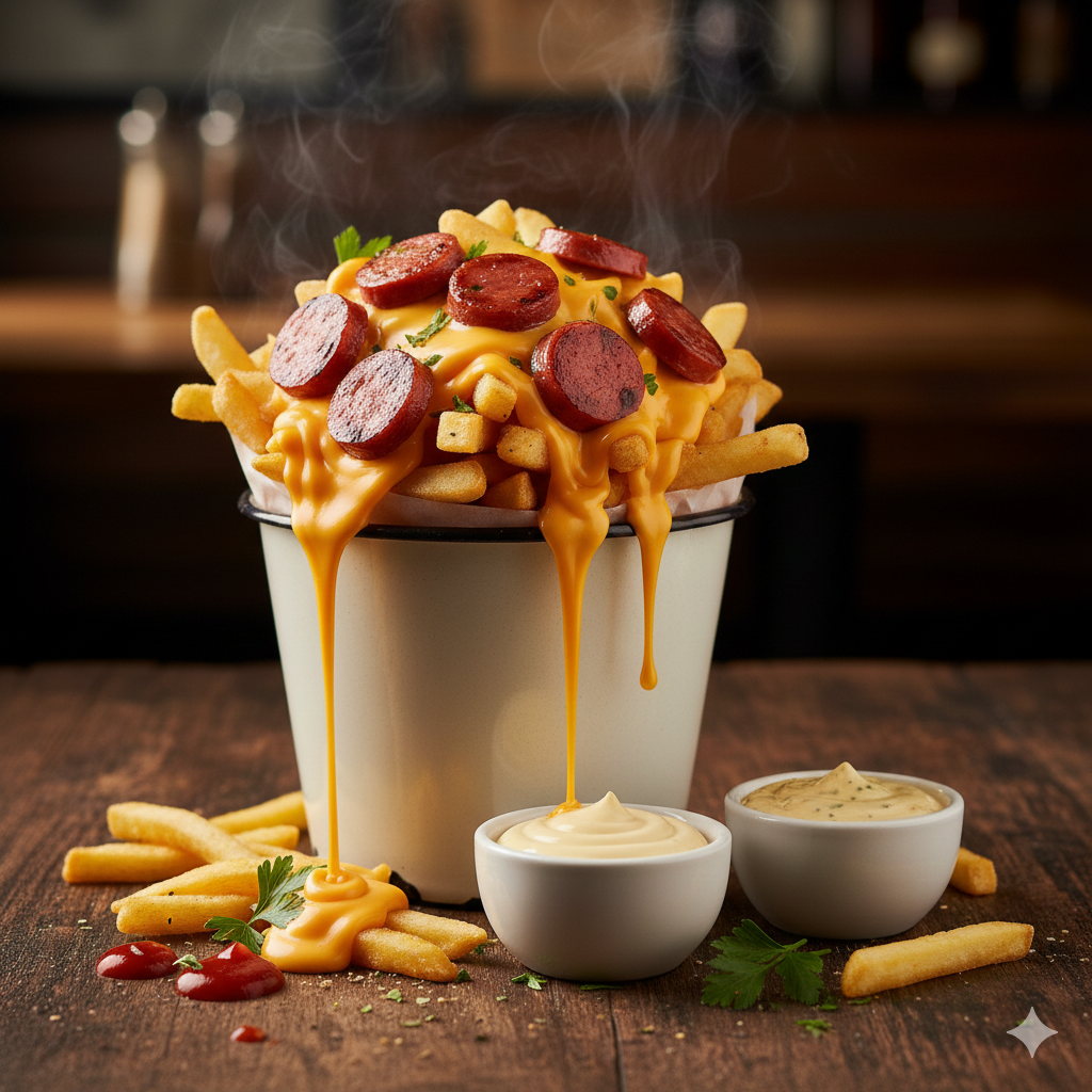 Papas fritas con rodajas de salchicha, salsa de tomate, queso cheddar y mayonesa artesanal.